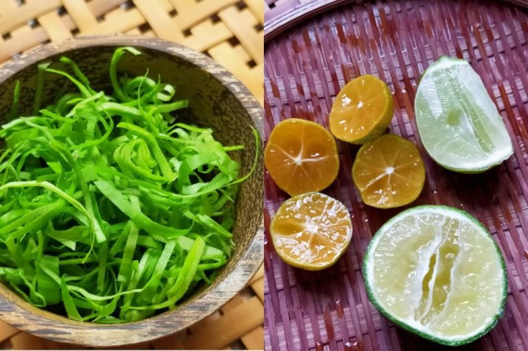 ขั้นตอนสุดท้ายก็คือเตรียมน้ำปรุง โดยบีบน้ำมะนาว ส้มจี๊ด ส้มซ่า ผสมกันในชามโคม ให้ได้รสเปรี้ยวหอมตามต้องการ เหยาะน้ำปลาดีๆ เอากลิ่นเสียหน่อย ทุบพริกขี้หนูสวนใส่ไปสักสามสี่เม็ด