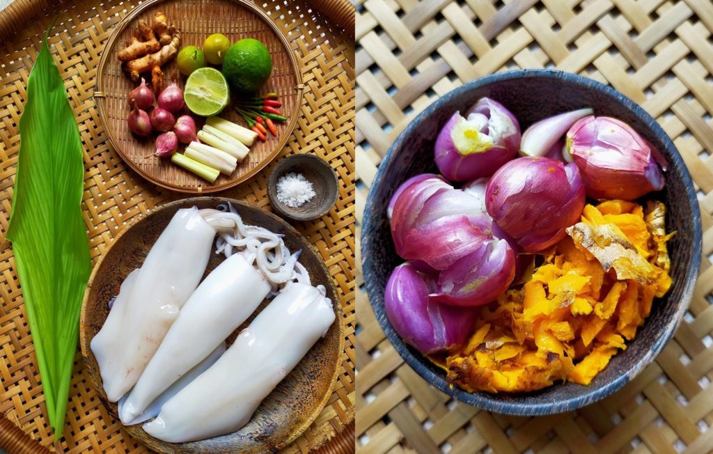 เช่นวันหนึ่ง ผมไปเห็นรูปอาหารของเพื่อนสมัยเรียนมัธยมต้น – คุณสุเจตน์ แสนคำ ผู้ซึ่งผันตัวเองไปเป็นเชฟ และเปิดร้าน Spice I Am ภัตตาคารอาหารไทยรสเลิศอยู่ที่ออสเตรเลีย เขาเผยแพร่รูป “หมึกต้มขมิ้น” แบบภูเก็ต แลดูน่ากินเป็นอันมาก ผมลองไปเสิร์ชหาในโซเชียลมีเดียดู ก็ไม่เห็นมีใครทำ พบแต่สูตรปลาต้มขมิ้น ไก่ต้มขมิ้นกันเป็นพื้น