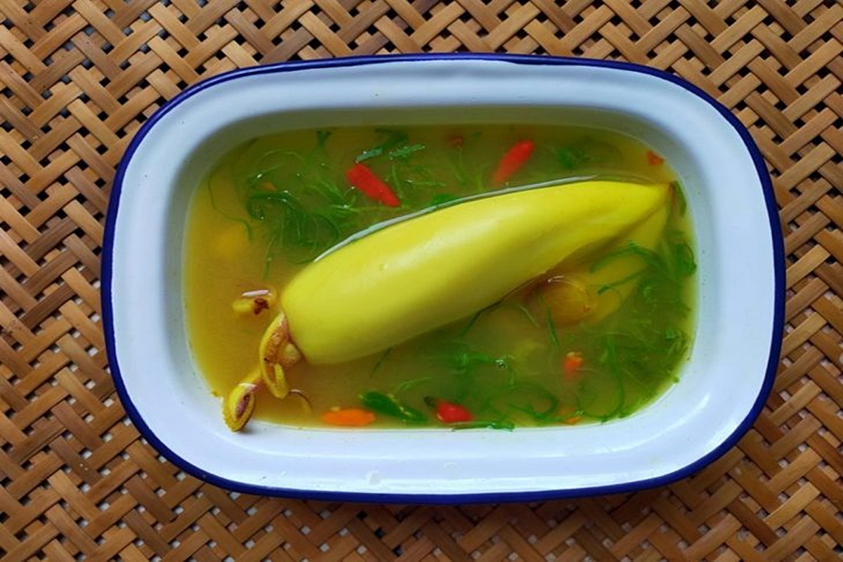 เริ่มทำโดยตั้งน้ำในหม้อจนเดือด ใส่ขมิ้นชันตำหยาบลงไปต้มจนน้ำกลายเป็นสีเหลืองค่อนไปทางส้มจัดๆ สักครู่ใหญ่ พอเห็นว่าคงจะไม่ส้มไปกว่านี้แล้ว จึงกรองเอากากออก ใส่ตะไคร้ทุบและหอมแดงบุบ ปรุงรสเค็มด้วยเกลือ พอกลิ่นสมุนไพรสดหอมโชยขึ้นมา น้ำเดือดพล่านดีแล้ว จึงใส่ปลาหมึกสดลงต้มจนสุก จะได้ซุปปลาหมึกรสเค็มอ่อนๆ สีเหลืองสวยน่ากินทีเดียว