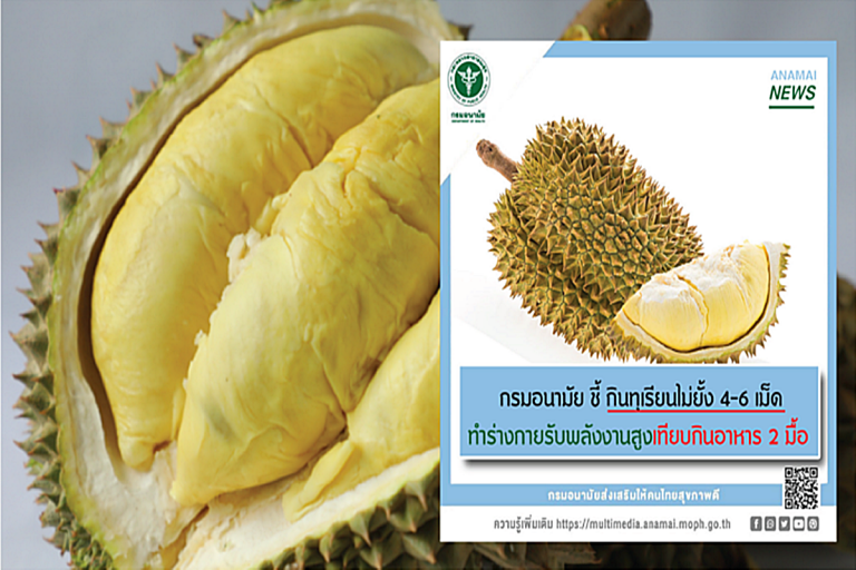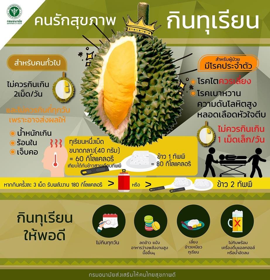 นพ.สราวุฒิ บุญสุข รองอธิบดีกรมอนามัย กล่าวว่า ทุเรียนจัดอยู่ในอาหารกลุ่มผลไม้ ที่มีวิตามินและแร่ธาตุต่างๆ รวมทั้งเป็นแหล่งของคาร์โบไฮเดรต หากต้องการกินทุเรียนให้ได้รับประโยชน์และคุณค่าทางสารอาหารที่เหมาะสม ไม่ควรกินทุเรียนเกินวันละ 2 เม็ด ไม่กินถี่ทุกวัน และลดอาหารกลุ่มข้าวแป้ง ของหวานในมื้อที่กินทุเรียนสูงถึง 520-780 กิโลแคลอรี ซึ่งเทียบเท่ากับกินข้าวมันไก่ 2 จาน หรือเท่ากับการกินอาหาร 2 มื้อ นอกจากนี้คนที่มีโรคประจำตัว เช่น โรคไต โรคเบาหวาน โรคหัวใจและโรคความดันโลหิตสูง ควรระมัดระวังเรื่องการกินทุเรียนมากกว่าคนทั่วไป อาจกินได้แต่ต้องกินในปริมาณน้อยกว่าคนปกติและไม่บ่อย เพราะการกินทุเรียนปริมาณมาก หรือกินทุเรียนบ่อยๆ จะส่งผลต่อปริมาณน้ำตาลและไขมันในเลือดของผู้ป่วยได้