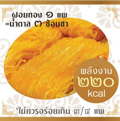 ขนมหวานเชื้อสายไทย สัญชาติโปรตุเกสชนิดนี้ งานบุญงานบาปทานได้ทานดีกันทุกเพศทุกวัย อร่อยล้ำกันง่ายๆ ทานเพลินกันตลอด แต่ใครที่ชอบทานจะทราบดีว่าภายใต้หน้าตาเรียบๆ สีเหลืองอมส้มที่เห็น เต็มไปด้วยไข่ น้ำตาล น้ำตาล และน้ำตาล เพราะฉะนั้นนอกจากปริมาณโปรตีนจากไข่แล้ว นอกนั้นน้ำตาลทั้งสิ้น น้ำตาลล้วนๆ