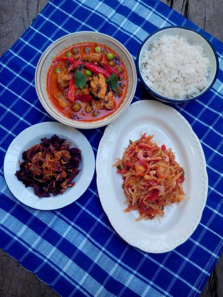 ภายใต้ลิ้นแบบไทยๆ ภาคกลางของผม ข้าวมันกะทิกับเนื้อฝอยผัดว่าแปลกแล้ว เจอกับแกงกะทิไก่ก็ยิ่งเลี่ยนลิ้นกันไปใหญ่ ถึงจะมีส้มตำเปรี้ยวๆ มาช่วยตัดรสก็เถอะ ไหนจะน้ำพริกมะขามเปียกผักทอดอีก รสโดยรวมของมันกระโดดออกมามากเสียจนนึกถึงชุดกับข้าวไทยที่ใกล้เคียงกันแทบไม่ออกเอาเลย
