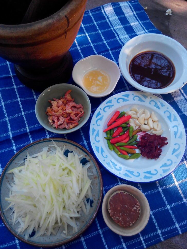 เครื่องส้มตำไทยมาตรฐาน มีมะละกอสับเป็นเส้น กระเทียม พริกแห้ง พริกขี้หนูสด น้ำมะขามเปียก น้ำปลา น้ำตาล น้ำมะนาว กุ้งแห้ง มะเขือเทศ