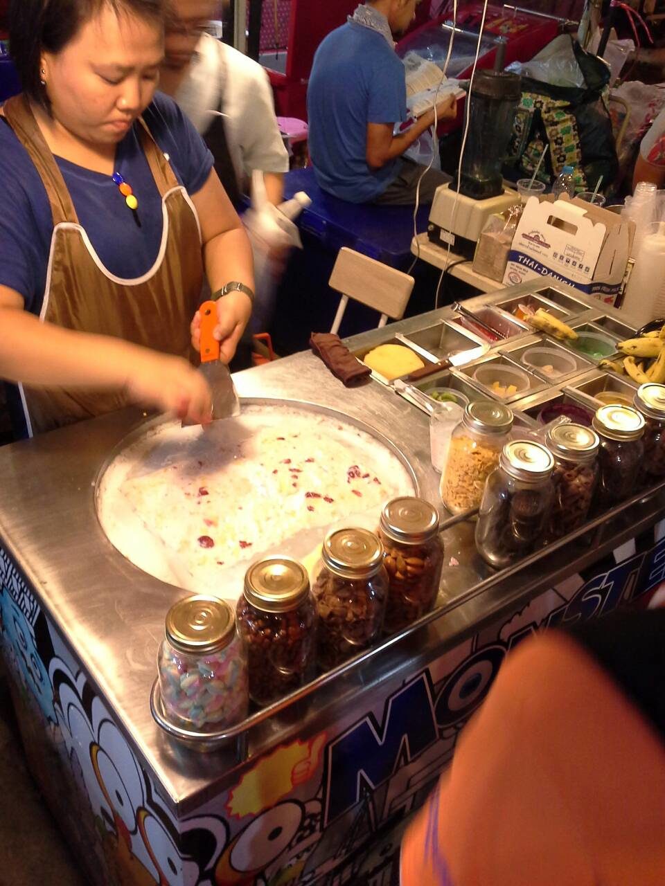 กระทั่งเมื่อราว 5 ปีก่อนหน้านี้ หันเข็มมาขายของรับประทาน เพราะมองตลาดแล้วว่าน่าจะขายได้ตลอด ไม่มีซบเซา ประกอบกับบ้านเราอากาศร้อนแทบทั้งปี ไอศกรีม จึงเป็นสินค้าน่าสนใจอย่างยิ่ง แต่ถ้าจะให้มาขายเป็นแท่ง เป็นถ้วย คงไม่มีจุดดึงดูดน่าสนใจนัก เลยโฟกัสไปที่ ไอศกรีมผัด ซึ่งเป็นที่นิยมในต่างประเทศมาระยะหนึ่งแล้ว ทดลองทำแบบลองผิดลองถูกอยู่หลายเดือน ไม่ได้อย่างใจคิด ออกมาเป็นเกล็ดๆ แบบไม่น่าทาน