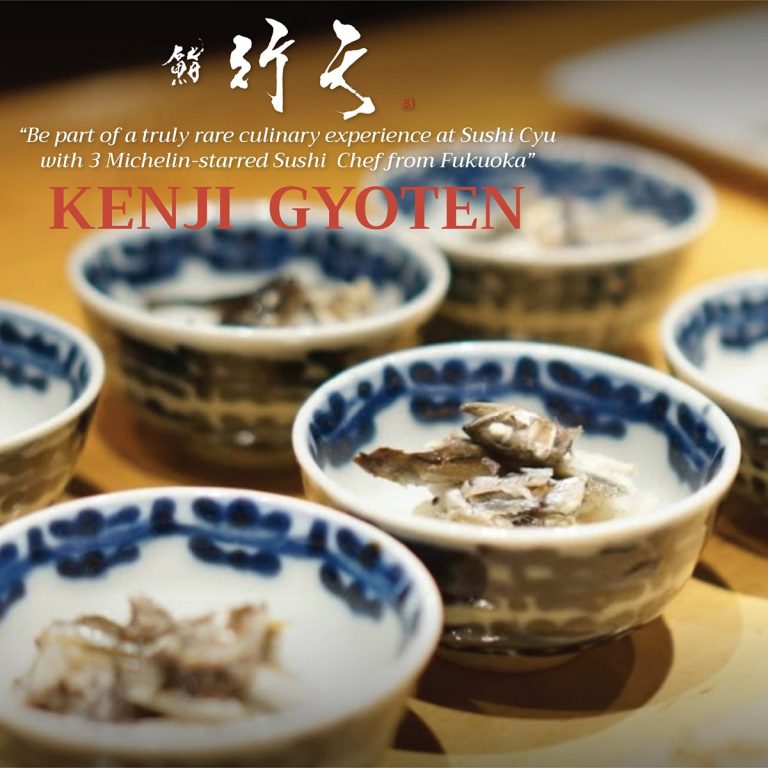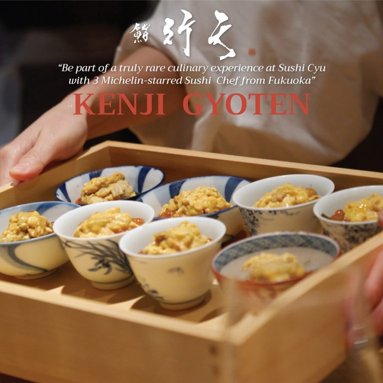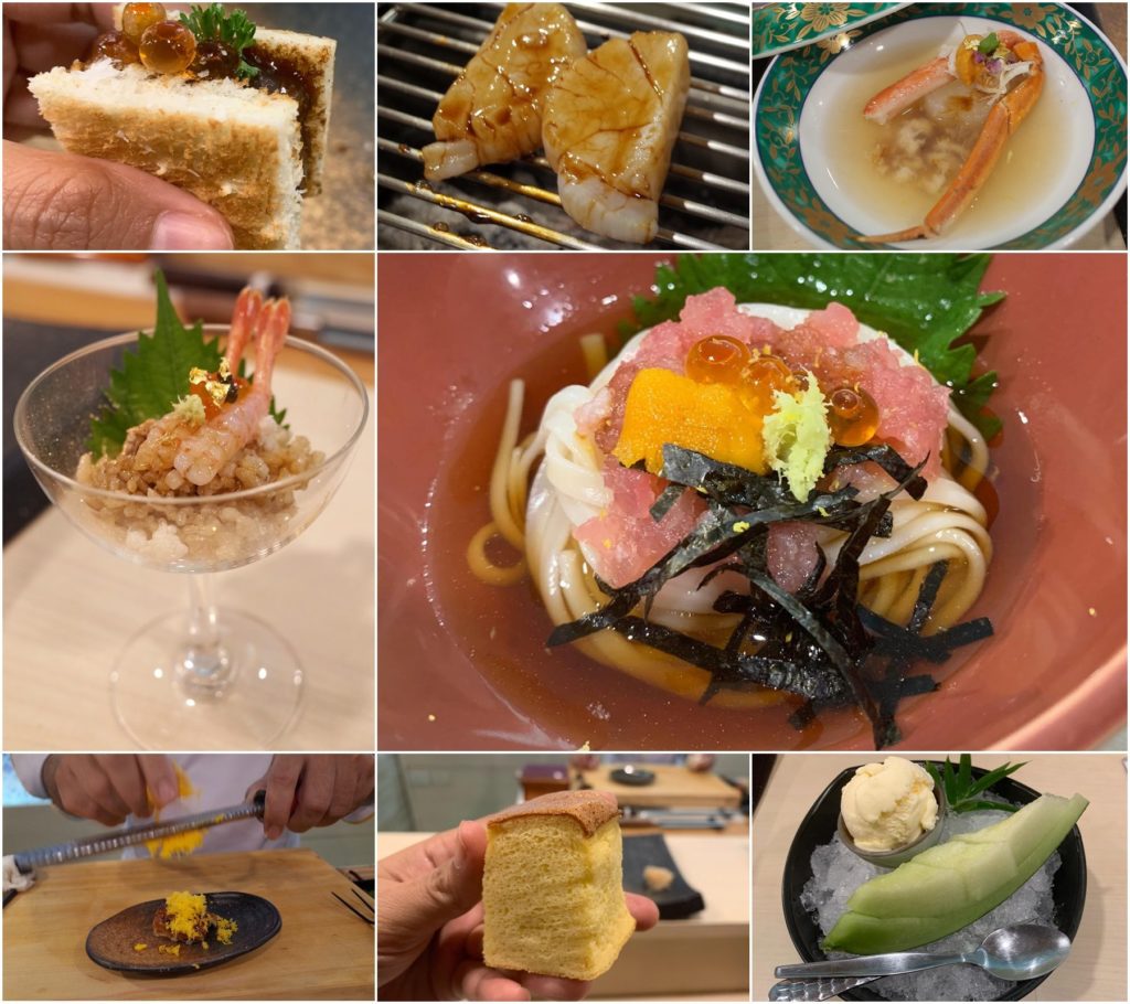 แอพพิไทเซอร์ 3 ตัวแรก ไล่เรียงมาได้แก่ “ไข่ตุ๋นเนื้อปูซูไว” ที่ไข่เนียนกริ๊บ นุ่มละมุน ไข่นี้เป็นไข่ไก่ออร์แกนิคจากญี่ปุ่น ท็อปปิ้งด้วยอูนิไข่หอยเม่นแต่งหน้าด้วยทองแผ่นเกรดสำหรับอาหาร นำเข้าจากญี่ปุ่น “ยาไซนิโมโน” หรือสลัดผักสไตล์ญี่ปุ่น คำนี้เพื่อเคลียร์รสชาติอื่นๆ ในปากก่อนที่จะเริ่มคำอื่นๆ “ซาชิมิ” เชฟเลือกใช้ปลาคัมปาจิ เป็นปลาข้างเหลืองญี่ปุ่น เนื้อขาว เทกเจอร์กรอบเด้งเล่นลิ้น แต่ยังมีไขมันแทรกในเนื้อให้สัมผัสที่นุ่ม ท็อปปิ้งด้วยไข่ปลาแซลมอน แตะวาซาบิที่ฝนสดนิดหน่อย ให้กลิ่นหอมขึ้นจมูกมากกว่ารสเผ็ด