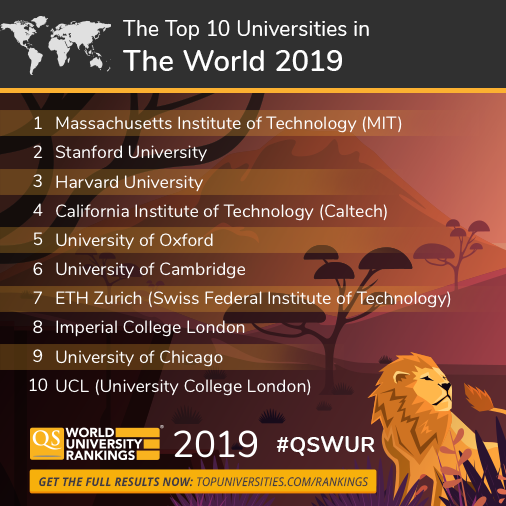 เมื่อวันที่ 7 มิถุนายน 2561 QS ก็ได้เปิดเผยผลประจำปี 2019 แล้ว โดยอันดับ 1 ยังคงเป็น สถาบันเทคโนโลยีแมสซาชูเซตส์ (MIT: Massachusetts Institute of Technology) ที่ได้คะแนนนำจากทั้งด้านการศึกษา การประสบความสำเร็จในการประกอบอาชีพ ที่ครองอันดับ 1 มาแล้วนับแต่ปี 2016
