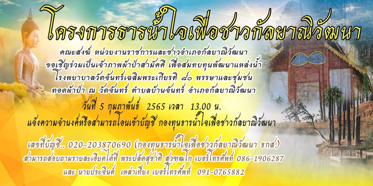ทางคณะสงฆ์ ผู้นำศาสนาทุกศาสนา หน่วยงานราชการ และชาวอำเภอกัลยาณิวัฒนา ขอเชิญร่วมเป็นเจ้าภาพผ้าป่าสามัคคี เพื่อสมทบทุนพัฒนาแหล่งน้ำ โรงพยาบาลวัดจันทร์เฉลิมพระเกียรติ 80 พรรษาและชุมชน ในวันที่ 5 กุมภาพันธ์ 2565 เวลา 13.00 น. ณ วัดจันทร์ ต.บ้านจันทร์ อ.กัลยาณิวัฒนา จ.เชียงใหม่ แจ้งความจำนงค์หรือโอนเข้าบัญชี “กองทุนธารน้ำใจเพื่อชาวกัลยาณิวัฒนา ธกส.” เลขที่ 020-203870690 สอบถามรายละเอียดเพิ่มเติมได้ที่ พระปลัดสุชาติ สุวฑฒโก 0861906287 นพ.ประจินต์ เหล่าเที่ยง 0910765882