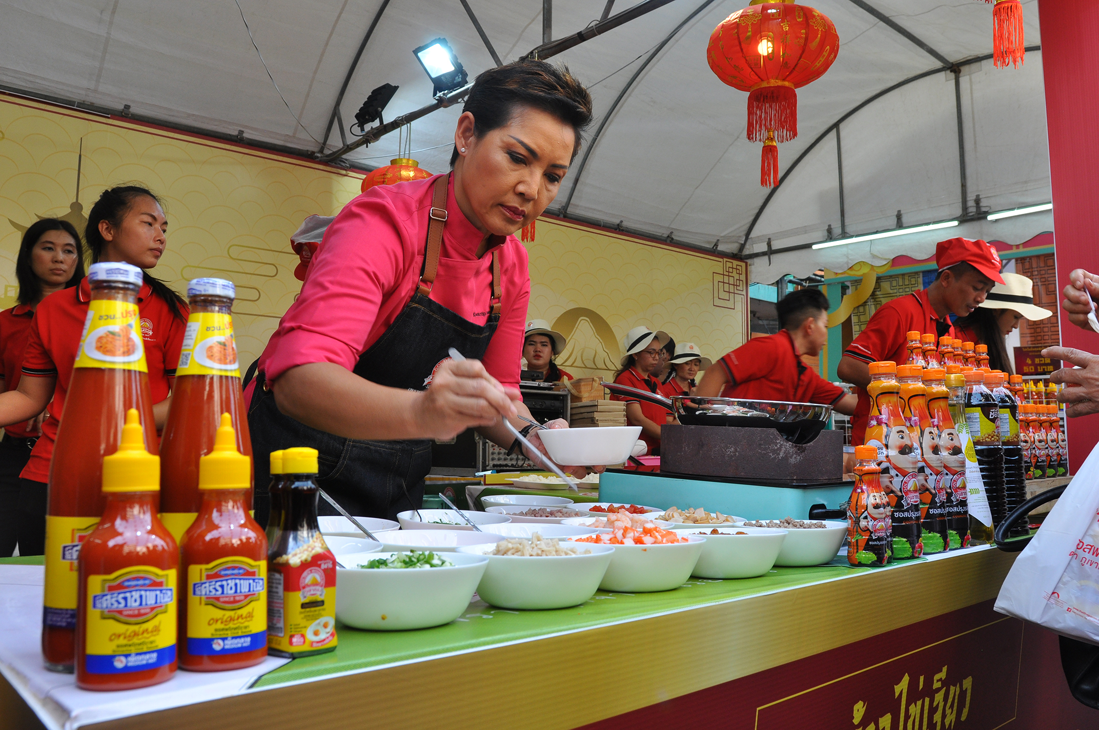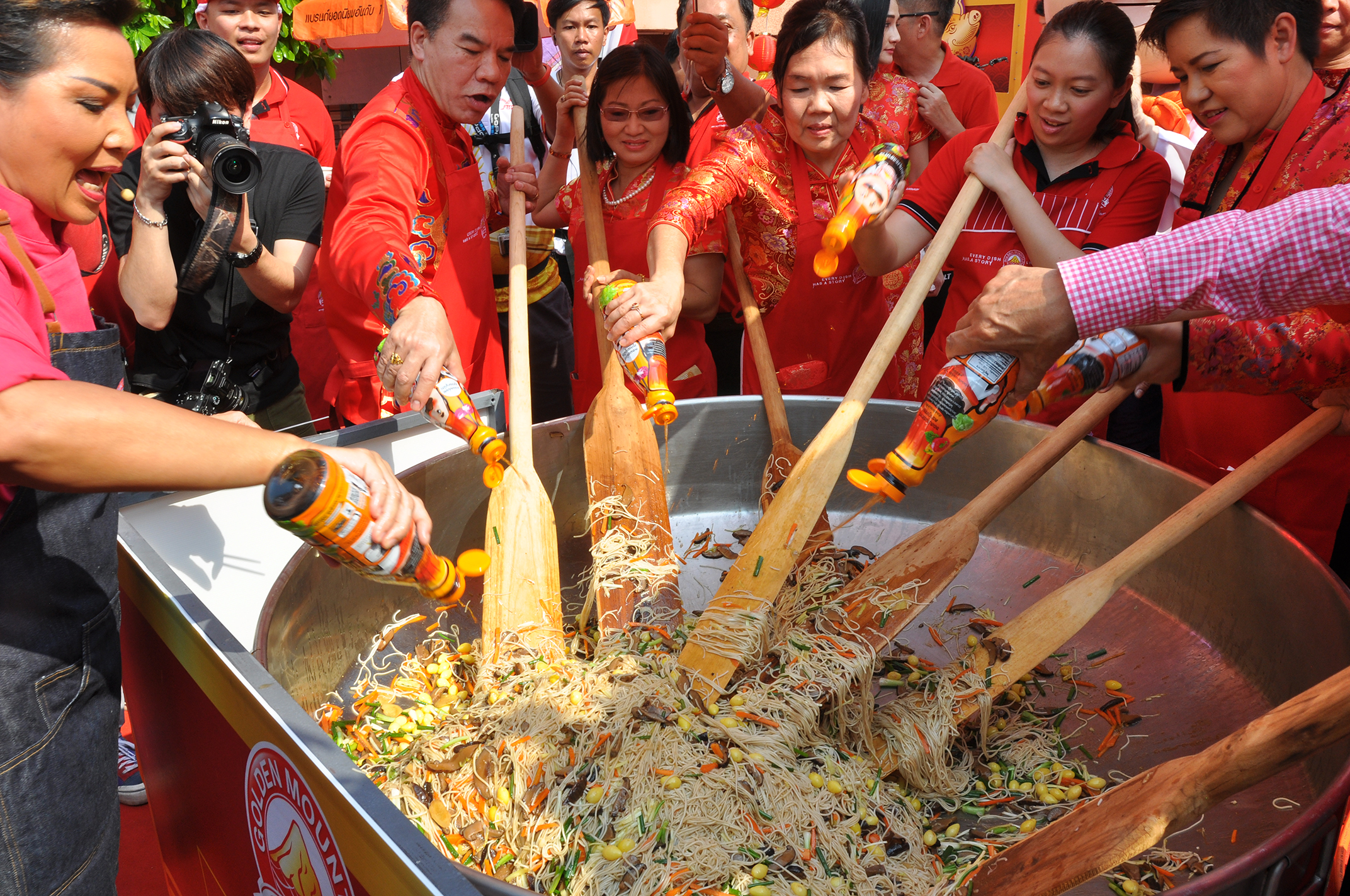 นางสาววรัญญา วิญญารัตน์ รองกรรมการผู้จัดการบริษัท ไทยเทพรส จำกัด (มหาชน) ผู้ผลิตและจัดจำหน่ายผลิตภัณฑ์ซอสภูเขาทอง กล่าวว่า ตรุษจีนปีนี้ ใช้ธีม ‘มั่นคง มั่งคั่ง ดุจดังภูเขาทอง สอดคล้องกับ แบรนด์ ‘ภูเขาทอง’ สื่อถึง ความยืนยาวมั่นคง ความมั่งคั่ง ความเป็นสิริมงคล โดยโชว์อลังการผัดหมี่กระทะยักษ์ เมนูผัดหมี่ภูเขาทอง แจกให้ผู้ร่วมงานกว่า 500 คน