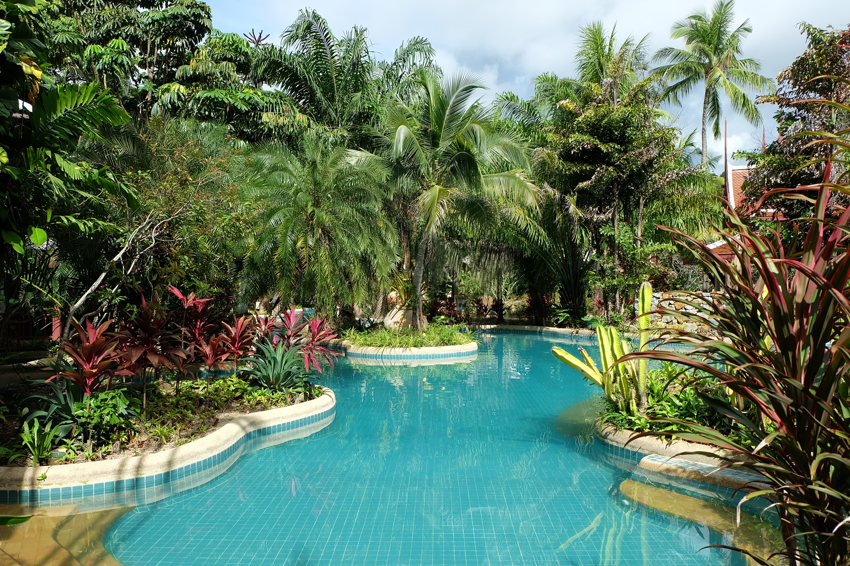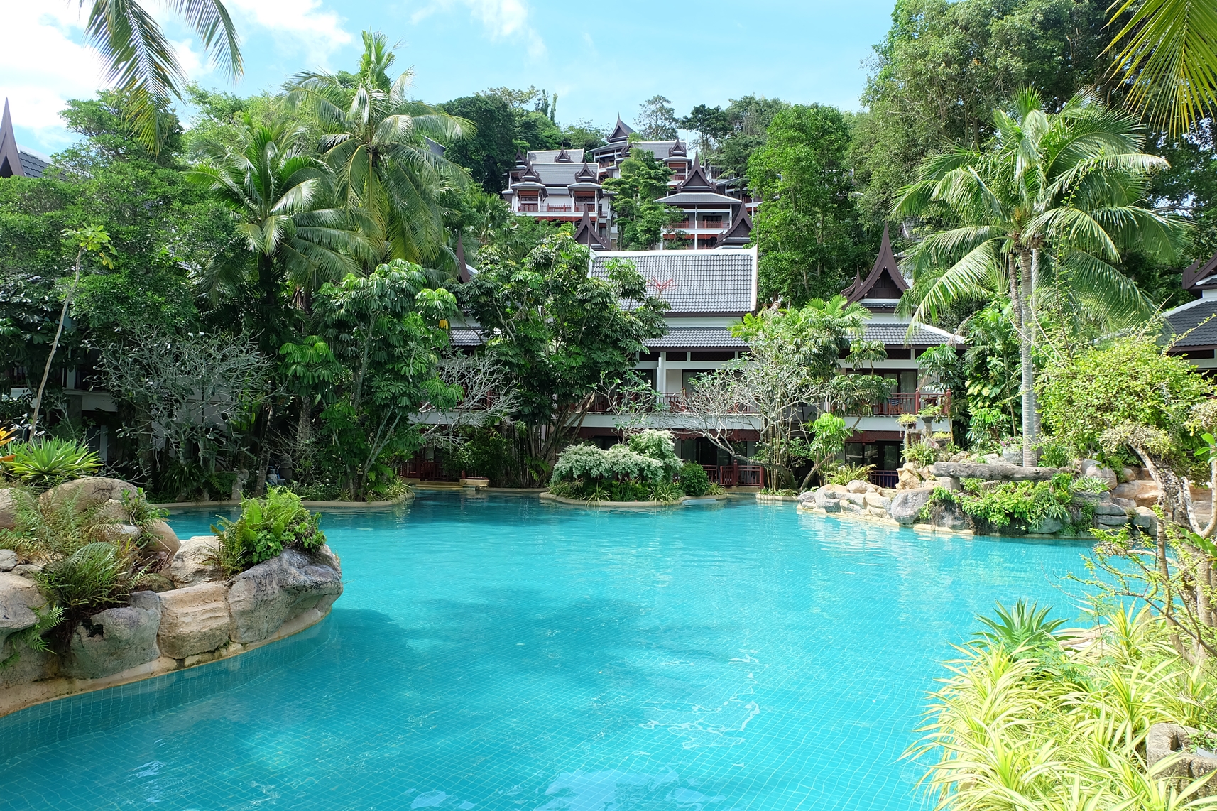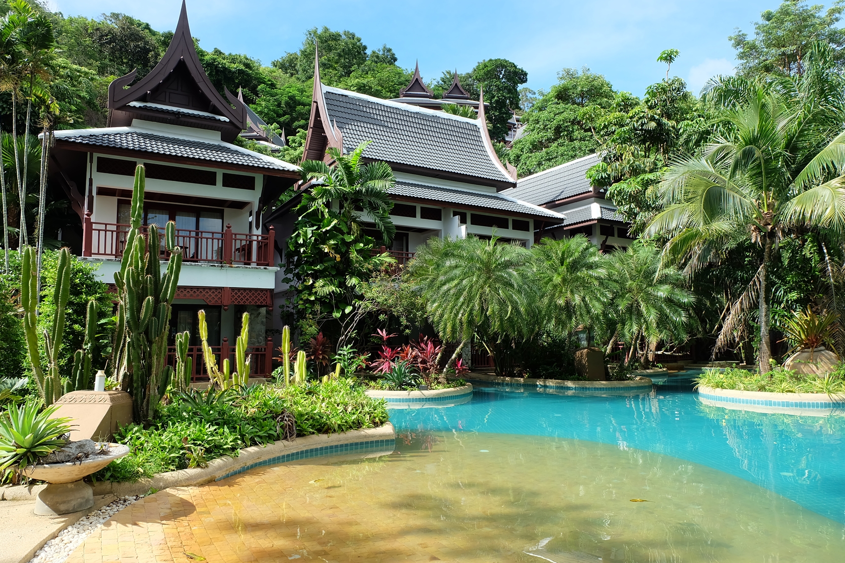 เห็นน้ำสีฟ้าใสของสระว่ายน้ำแล้วก็อดจะลงไปเชยชมไม่ได้ ตัวสระมีขนาดใหญ่อยู่ท่ามกลางแมกไม้นานาพรรณ จึงมีจุดใต้ร่มไม้ต่างๆ ให้แวะพักหากรู้สึกร้อน ซึ่งไม่เพียงแต่สระว่ายน้ำเท่านั้น แต่รอบๆ โรงแรมก็ร่มรื่นไม่แพ้กัน พร้อมตกแต่งด้วยรูปปั้นสไตล์ไทยหรือตัวละครในวรรณคดี ซึ่งเป็นความชอบของผู้ก่อตั้งโรงแรม