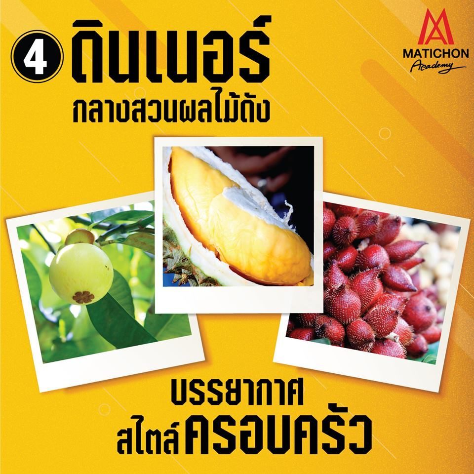 | 16.20 น. | ถึง สวนสาวสุดใจ สวนขนาดย่อมที่มีชื่อเสียงมานานจากโลกโซเชียล ให้ท่านได้ลิ้มชิมรสบุฟเฟ่ต์ผลไม้นานาชนิด ไม่ว่าจะเป็นทุเรียน, ลองกอง, เงาะ, มังคุด และสละ พร้อมเดินชมสวนในบรรยากาศแบบกันเองสไตล์ครอบครัว โดยคุณอรอุมา สุดประเสริฐหรือป้าสาว เจ้าของสวนอารมณ์ดีที่ยินดีต้อนรับด้วยรอยยิ้มเสมอ จากนั้นช่วงเย็นร่วมรับประทานอาหารเย็นกลางสวนผลไม้ ชิมเมนูพื้นบ้านเลิศรส พิเศษ!!! ชมการสาธิตเมนูคาวหวานจากผลไม้ขึ้นชื่อแห่งภาคตะวันออก โดยทีมเชฟจากมติชนอคาเดมี ที่ไม่เคยโชว์ที่ไหนมาก่อน |