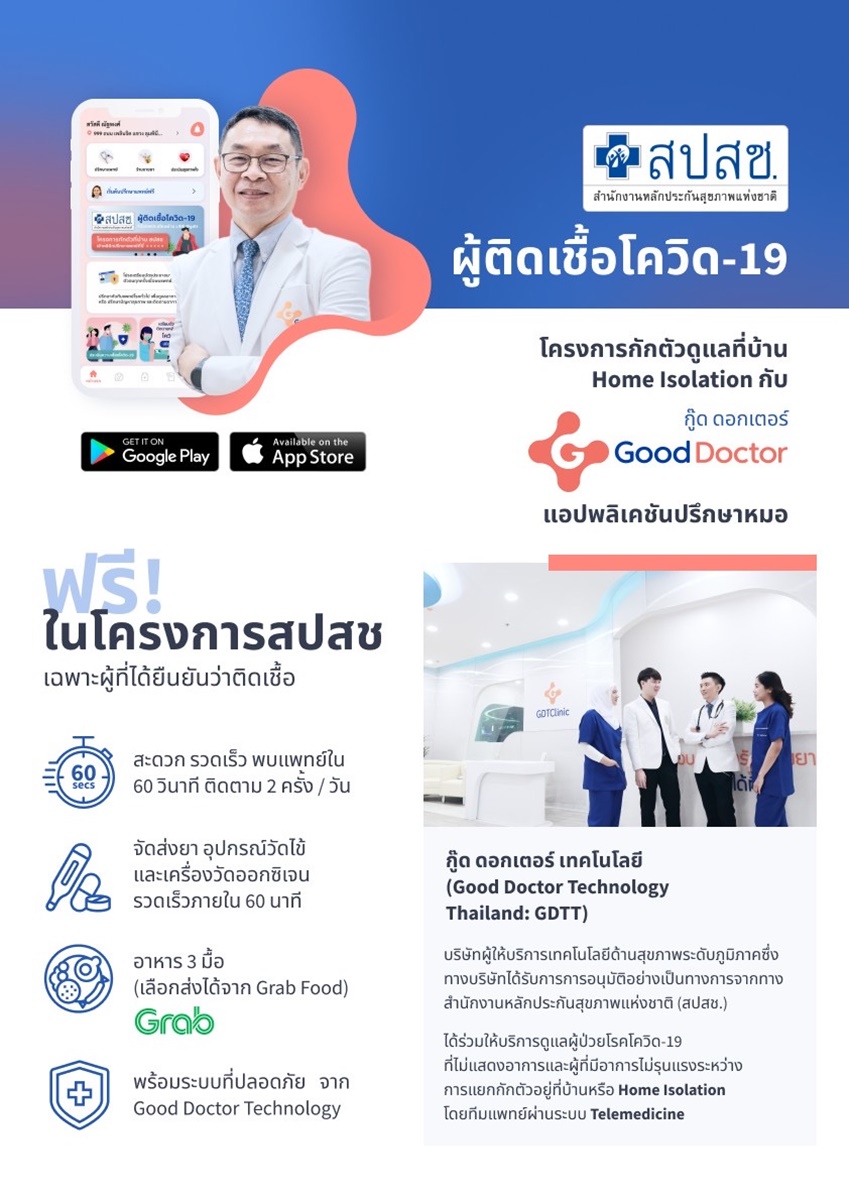 ในวันที่ 25 สิงหาคม ปี 2564 ที่ผ่านมา จีดีทีทีได้รับการการอนุมัติอย่างเป็นทางการจากทางสำนักงานหลักประกันสุขภาพแห่งชาติ (สปสช.) ให้เป็นผู้ให้บริการดูแลผู้ป่วยโรคโควิด-19 ที่ไม่แสดงอาการและผู้ที่มีอาการไม่รุนแรงระหว่างการแยกกักตัวอยู่ที่บ้านหรือ Home Isolation คุณสุชาดา เข็มเงิน หนึ่งในผู้ป่วยรายแรก ๆ ที่ได้เข้ารวมโครงการ Home Isolation ได้แสดงความคิดเห็นถึงความมีประสิทธิภาพและความรวดเร็วในการพบแพทย์และการรับการรักษาผ่านแอปพลิเคชัน Good Doctor ว่า “ในตอนแรกฉันคิดว่าการใช้งานแอปพลิเคชัน Good Doctor จะยุ่งยาก แต่ทีมแพทย์และแอดมินก็ให้คำแนะนำการใช้เป็นอย่างดี ฉันได้รับคำปรึกษาอย่างรวดเร็วและตรงจุดทุกครั้งที่กังวลเกี่ยวกับอาการ นอกจากนี้การส่งยาและอุปกรณ์การแพทย์ได้ภายใน 1 ชั่วโมง ก็น่าประทับใจ”