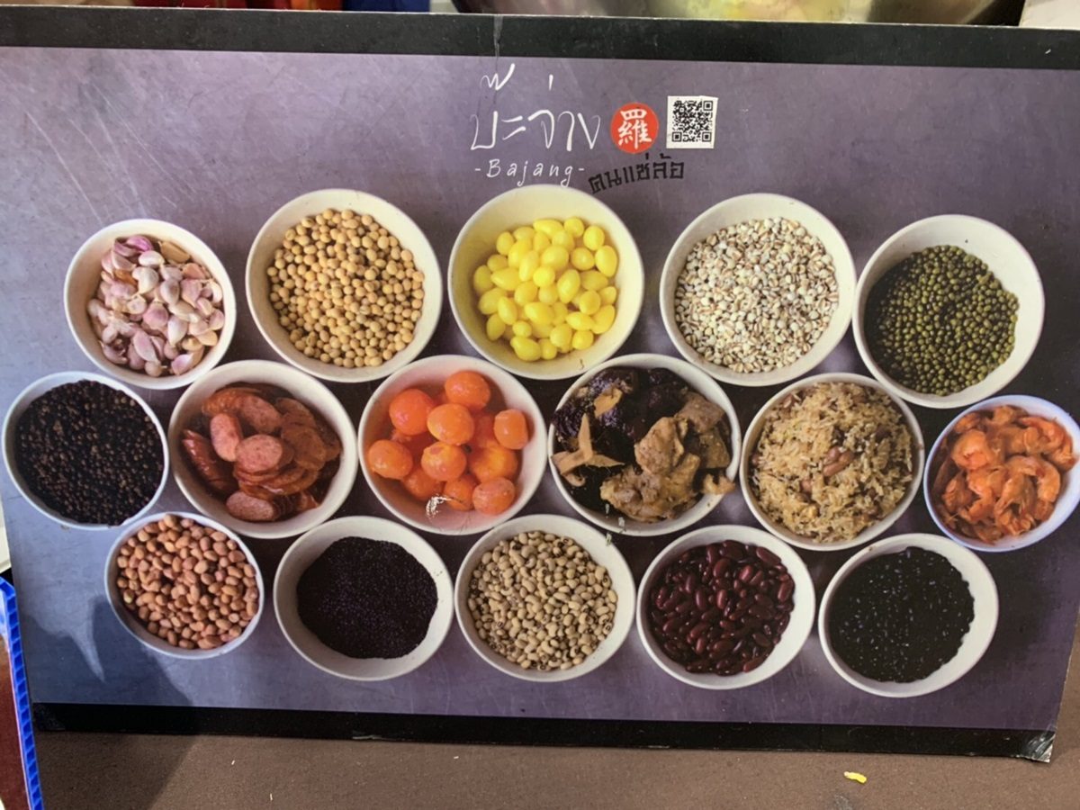 “ส่วนประกอบข้างในบะจ่างฅนแซ่ล้อ มีหมู กุนเชียง กุ้ง เห็ดหอม แปะก๊วย ไข่เค็ม เสริมด้วยธัญพืชพวกถั่วดำ ถั่วแดง ถั่วเขียว ถั่วลิสง งาดำ งาขาว และลูกเดือย ส่วนผสมพิเศษกว่าที่อื่นเพราะเห็นว่าธัญพืชน่าจะเป็นประโยชน์กับคนกินที่รัก