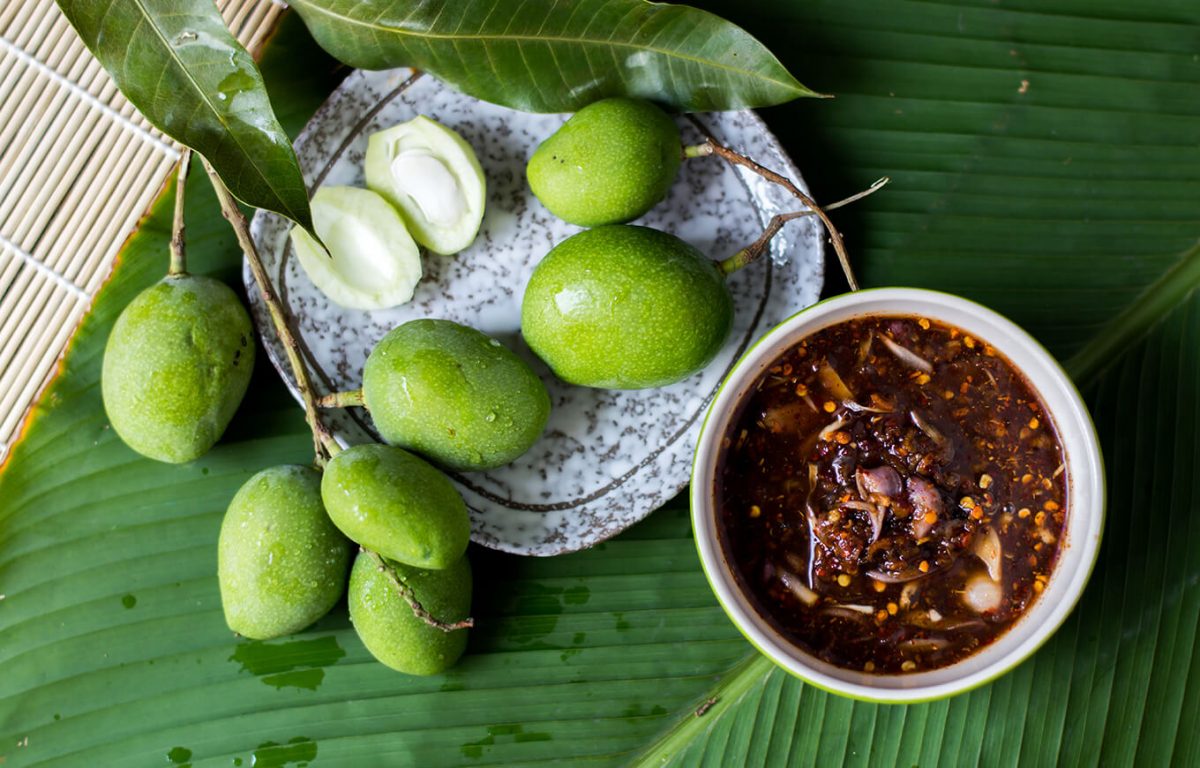 ยอดมะม่วงอ่อน ปลากระป๋อง หรือมะเขือเทศที่ผัดจนเปื่อยกับเนื้อปลาย่าง ดีปลีแห้ง พริกแห้ง ปลาแห้ง เกลือ