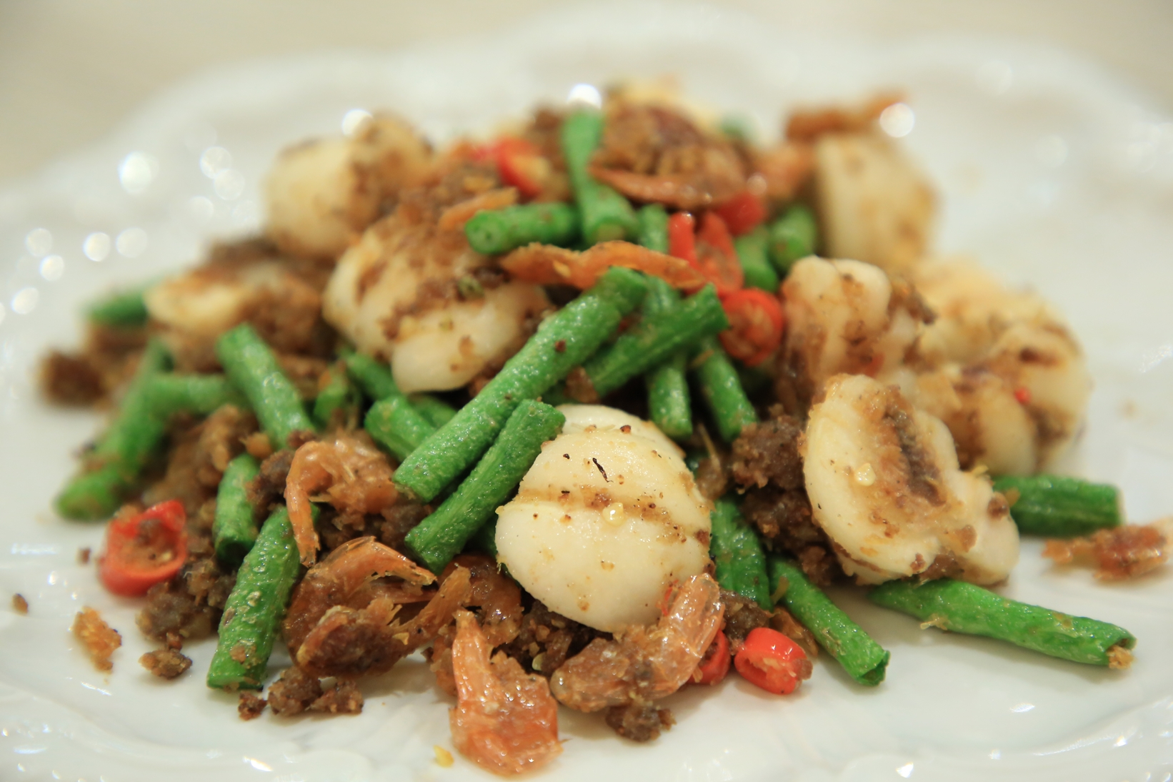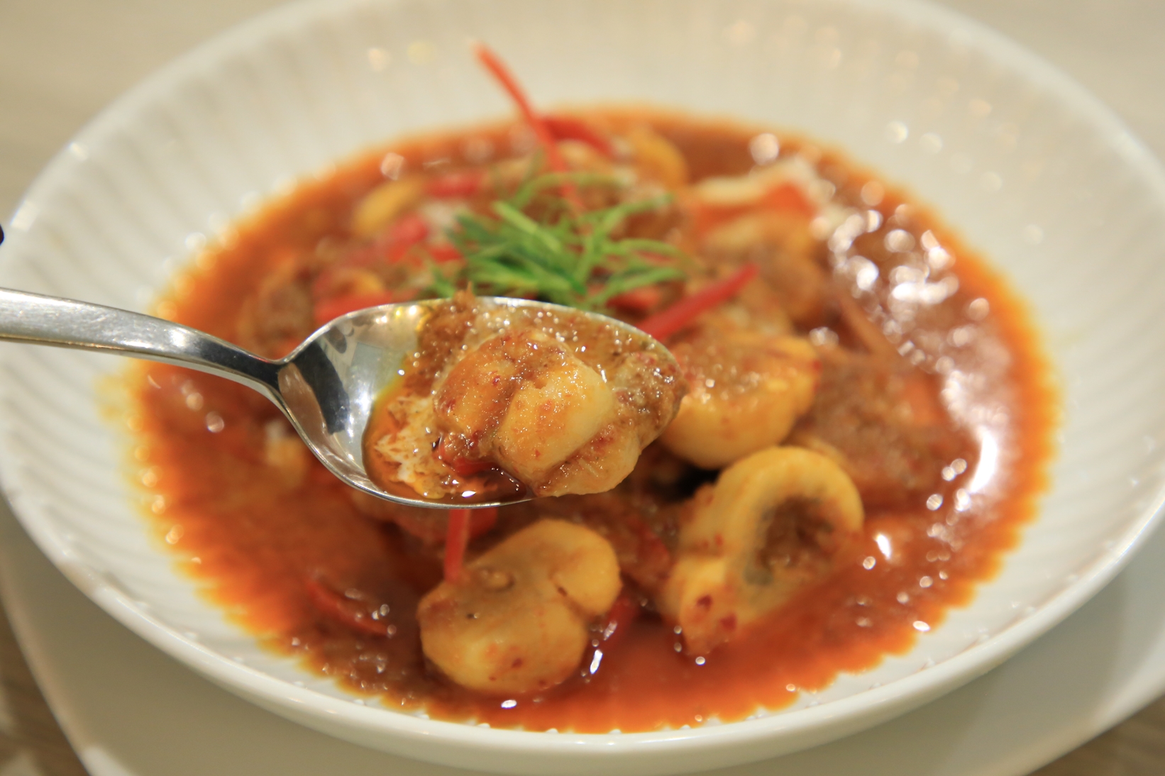 เริ่มกันที่เมนูแรก “ถั่วฝักยาวคั่วกะปิกุ้งแก้วมังคุดคัดเมืองคอน” ต้องบอกว่า หอมกลิ่นกะปิคั่วที่เคล้ากับเครื่องเทศเรียกน้ำย่อยชนิดที่ว่าขอข้าวร้อนๆ ด่วนๆ ส่วนมังคุดคัดเพิ่มความละมุนให้จานนี้ด้วยการตัดรสชาติกันแบบคนละทาง แต่พอเคี้ยวรวมกันแล้วเข้ากันได้ดีมาก เรียกว่าครบทุกรสจริงๆ
