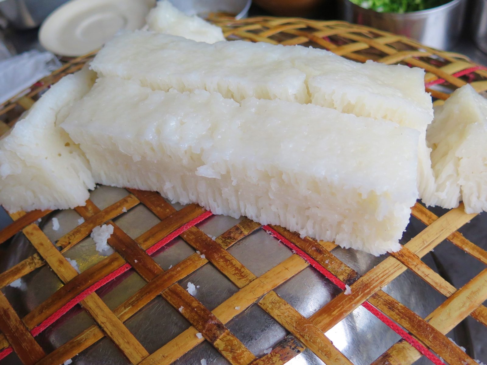 มาที่จีบขาวต้องชิมของดีที่คนตรังเรียกชื่อได้ถูกต้องว่า “ปาท่องโก๋” ซึ่งความจริงแล้วปาท่องโก๋ มาจากภาษากวางตุ้งว่า “ปักถ่องโก้ว” คือ “ขนมแป้งนึ่งสีขาวฟูๆ มีรูพรุนชิ้นสี่เหลี่ยม” เนื้อแป้งนุ่มๆ รสอมหวาน พี่ซินบอกว่า ทำจากข้าวเก่านำมาโม่ ผสมกับน้ำตาลทราย ขึ้นฟูด้วยยีสต์สดธรรมชาติ แต่ละวันพี่ซินจะนึ่งปาท่องโก๋แล้ววางขายอยู่บนสุ่มโค้งทำจากไม้ไผ่สาน หมดแล้วหมดเลย วันนั้นเกือบไม่ได้ชิมเพราะมีเหลือเท่าที่เห็นในรูป