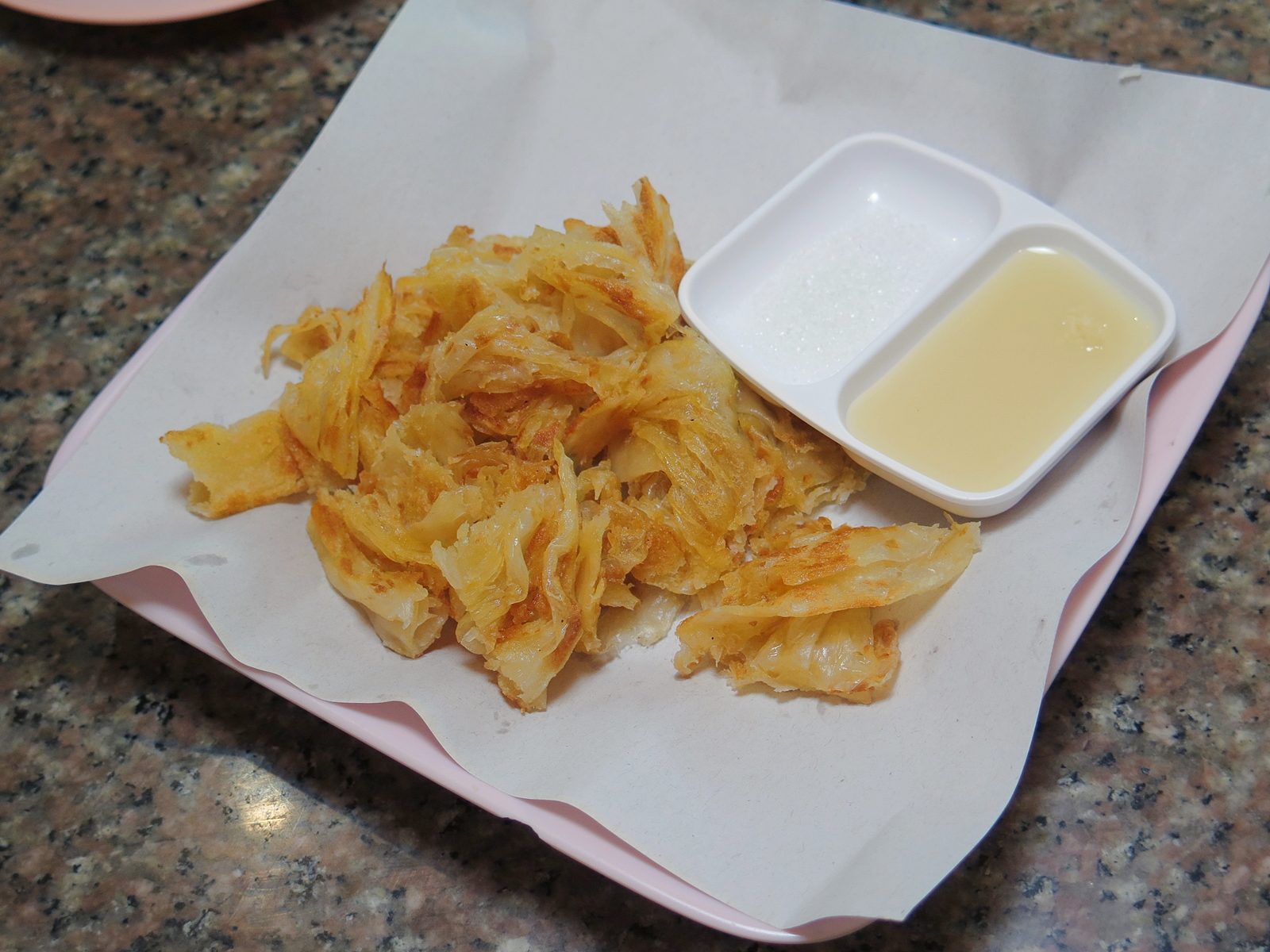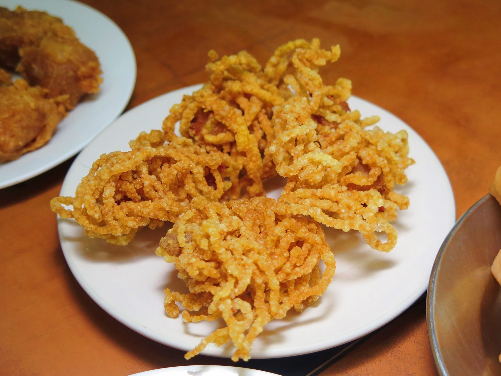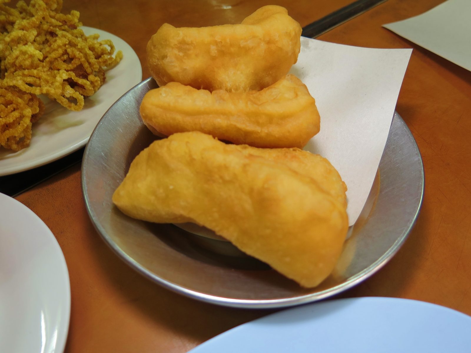 ส่วนปาท่องโก๋ แป้งทอดสีน้ำตาลที่เราคุ้นเคย จะเรียกว่าอิ่วจาก้วย หรือ “จาโก้ย” หรือที่พี่ซินเรียกว่า จ่าโก๊ย ก็มีให้กินด้วย แล้วก็มี “หมี่พัน (หมู) ทอด” เป็นเส้นหนาๆ สีน้ำตาลเป็นก้อนขยุ้ม กับ “เปาะเปี๊ยะทอด”