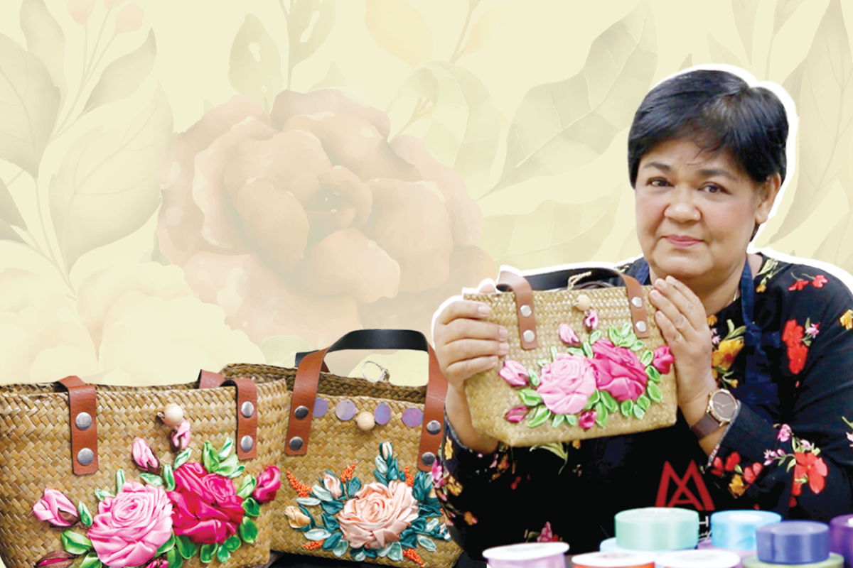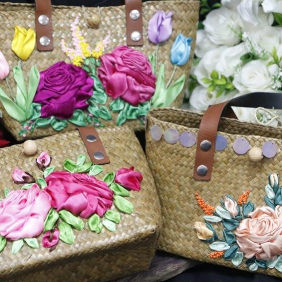 “มาช่วงหลังริบบิ้นเริ่มมีความนิยมมากขึ้น เริ่มหาซื้อได้ง่ายขึ้น แต่ก่อนซื้อตามเน็ต แต่เดี๋ยวนี้มีแหล่งขาย พอมาลองปักริบบิ้นบนกระเป๋ากระจูดก็ไม่ยาก สวยเหมือน3มิติ ถ้าเราวาดภาพมันก็จะเหมือนเรียบๆไป หรือว่าเอาผ้ามาปัก เอาลูกไม้มาปักก็จะเรียบๆไป แต่ถ้าเป็นริบบิ้นจะมีมิติขึ้นมา ทำให้เริ่มมาจับตัวนี้อย่างจริงจัง”