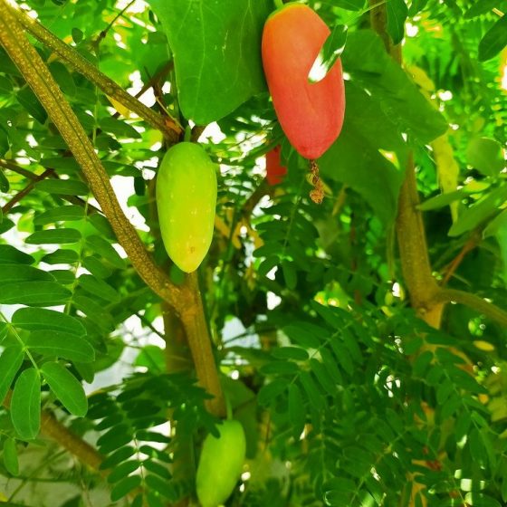 แต่ก็มีพืชบางชนิดนะครับ ที่พอจะออกดอกออกผลให้เก็บกินได้บ้าง โดยที่เราไม่ต้องไปจัดการอะไรกับมัน อย่างหนึ่งก็คือต้นกระถินข้างทาง ที่อยู่ในช่วงติดฝักแก่ฝักอ่อนให้เก็บได้ แล้วก็ต้นคูน หรือราชพฤกษ์ (Cassia fistula) ที่ทางราชการปลูกเรียงรายเป็นไม้ประดับไว้ริมถนน ออกดอกเป็นพวงระย้าสีเหลืองสดทั่วทุกมุมเมืองเวลานี้