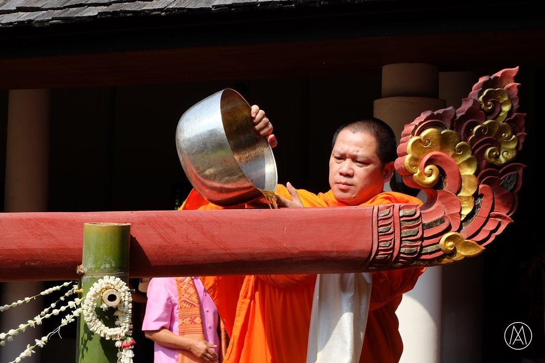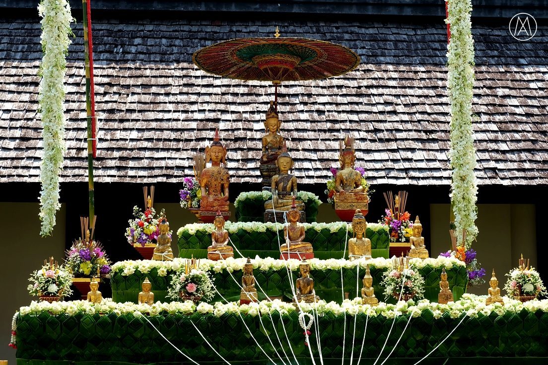 พิธีเริ่มขึ้นเมื่อคณะสงฆ์นำผู้อาวุโสเข้าสู่การสรงน้ำ “พระเจ้าไม้” หรือพระพุทธรูปไม้โบราณจำนวน 16 องค์ จากรางพญานาค ซึ่งการสรงน้ำพระเป็นพิธีที่คนโบราณเชื่อว่าพระพุทธรูปเป็นตัวแทนของพระพุทธเจ้าเป็นสิ่งที่มีชีวิต ไม่ใช่เป็นเพียงอิฐหรือไม้ การสรงน้ำหมายถึงการให้ความเคารพนบนอบแก่พระพุทธเจ้านั่นเอง นอกจากนี้ คนโบราณยังคิดว่าในช่วงหน้าร้อน พระพุทธเจ้าคงจะร้อน จึงมีการสรงน้ำเพื่อให้ท่านได้คลายร้อน