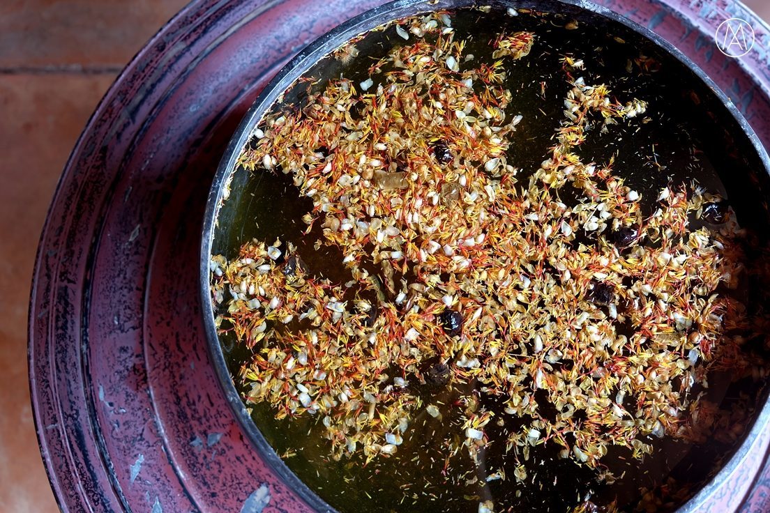 ในน้ำขมิ้นส้มป่อยยังใส่เกสรดอกสารภีและน้ำอบเพื่อความหอมอีกด้วย