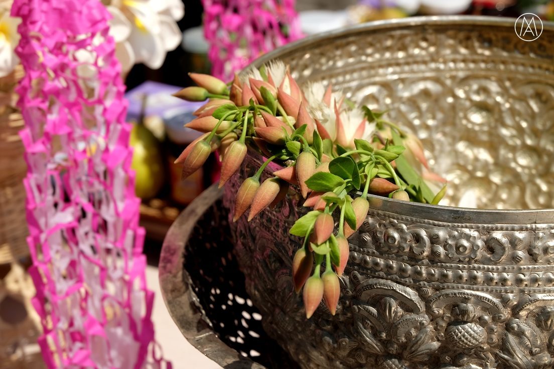 บริเวณพิธีนอกจากมีการประดับด้วยดอกไม้นานาพรรณแล้ว ยังมีการประดับตุง ซึ่งตุงนี้ทำมาจากดอกไม้แทนตุงผ้า ด้วยความเชื่อว่าจะได้ส่งความหอมไปได้ไกลขึ้น