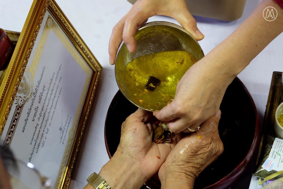 จากนั้นขบวนสาวสงกรานต์เชิญเครื่องคำนับเข้าสู่บริเวณพิธี ก่อนที่นายณรงค์ศักดิ์ โอสถธนากร ผู้ว่าราชการจังหวัดเชียงราย จะมอบประกาศนียบัตรแก่ผู้อาวุโส และท่านผู้หญิงบุตรี วีระไวทยะ กรรมการและเลขาธิการ มูลนิธิแม่ฟ้าหลวงฯ จะมอบน้ำขมิ้นส้มป่อยและเครื่องคำนับเพื่อคารวะผู้อาวุโส ตามด้วยผู้ร่วมงานเข้ารดน้ำผู้อาวุโส ซึ่งจะรดไปที่มือเท่านั้น แต่ในสมัยโบราณจะเป็นการนำน้ำส้มป่อยมาวาง แล้วผู้สูงวัยจะเอามือแตะที่น้ำมาลูบหัว