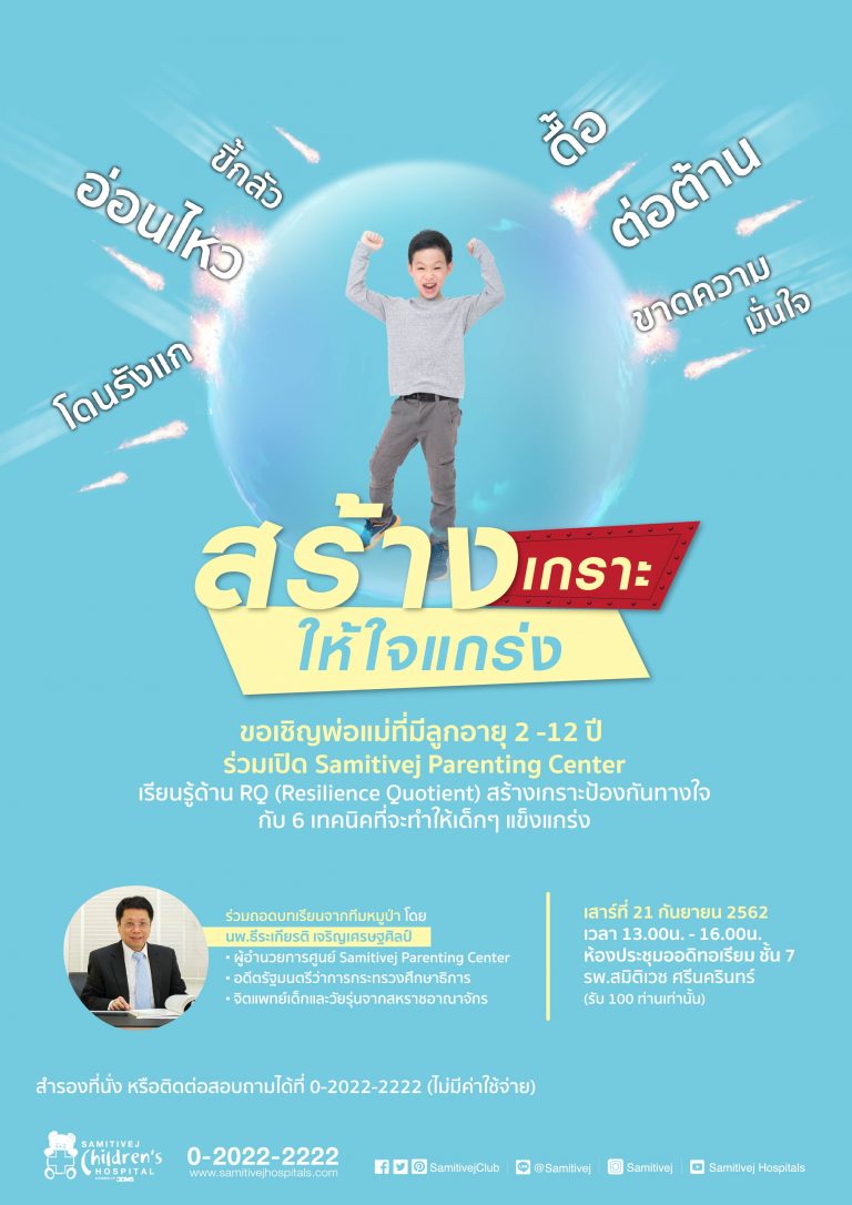สำหรับผู้ที่สนใจมาร่วมกันซักถามและหาทางออกให้กับวิกฤตนี้ร่วมกันได้ในงาน เปิด Samitivej Parenting Center เพื่อการเรียนรู้ด้านอารมณ์ RQ ย่อมาจาก Resilience Quotient #สร้างเกราะให้ใจแกร่ง วันเสาร์ที่ 21 กันยายน 2562 เวลา 13.00-16.00 น. ณ ห้องประชุมออดิทอเรียม ชั้น 7 โรงพยาบาลสมิติเวช ศรีนครินทร์ (จำกัดแค่ 100 ท่านเท่านั้น) สำรองที่นั่งได้ที่ 0-2022-2222 ไม่เสียค่าใช้จ่าย