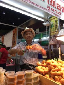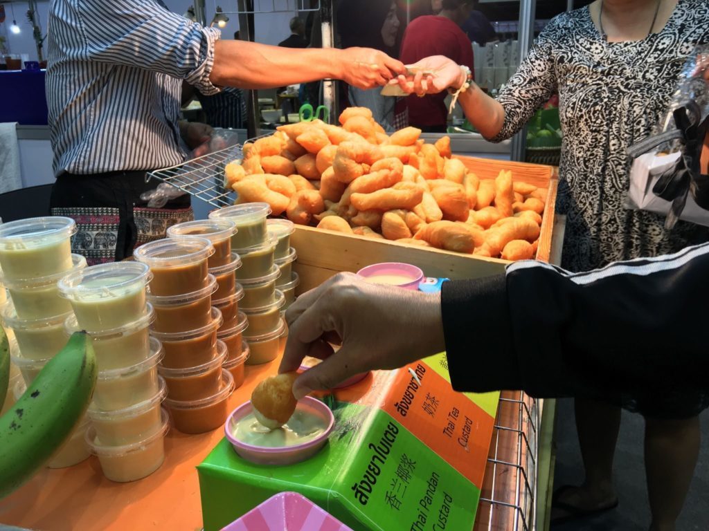 ก่อนเล่าต่อถึงปาท่องโก๋สูตรฮ่องกง จะออกขายตามงานแสดงสินค้าเป็นหลัก รวมถึงรับจัดเลี้ยงนอกสถานที่ มีทีมสำหรับออกงาน 2 ทีม บางครั้งให้ลูกชายเป็นคนขาย บางครั้งให้ลูกน้องออกขายแล้วแต่งาน สำหรับปาท่องโก๋ร้านลุงชวนจะเป็นเกลียวชิ้นใหญ่ สูตรกรอบนอกนุ่มใน ทานคู่กับเครื่องจิ้ม 4 สูตรคือ สังขยาใบเตย สังขยาชาไทย เนย&นม นมข้นหวาน แต่ละรสเป็นสูตรที่ลุงชวนศึกษาจากหนังสือ แล้วปรุงแต่งให้มีกลิ่นอายของรสมือคุณลุงอีกที