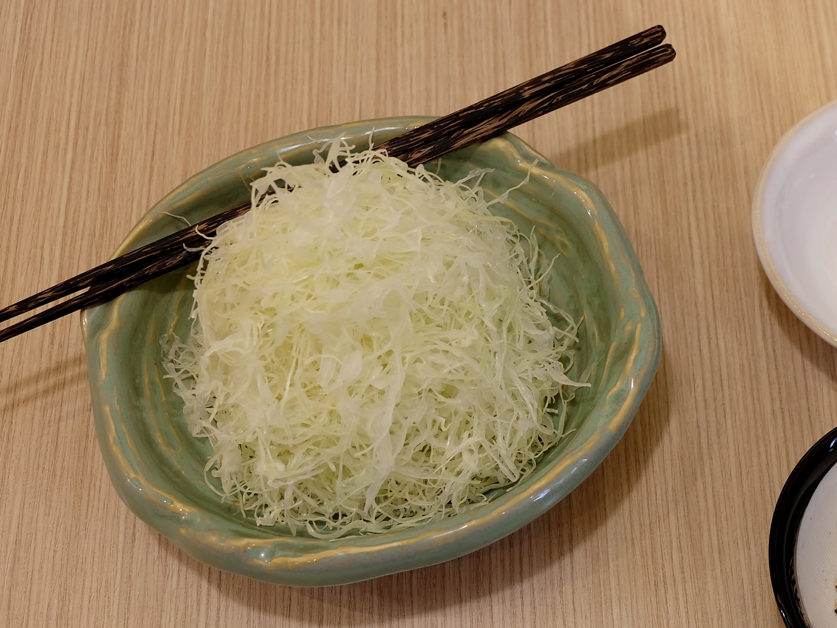 ส่วนกะหล่ำปลีฝอยก็มีน้ำสลัดให้เลือกกินตามใจชอบ 2 แบบ คือ น้ำสลัดข้น ที่จะมีรสหวาน มัน เปรี้ยวปลายเล็กน้อย และน้ำสลัดใสที่มีรสออกเปรี้ยวเค็ม ลองกินคู่กับน้ำสลัดข้นแล้วเข้าท่าทีเดียว ราดแต่พอเล็กน้อยก็อร่อยแล้ว ส่วนกะหล่ำปลีที่ใช้เป็นกะหล่ำปลีออร์แกนิคจากเชียงราย ผ่านวิธีการล้างหลายชั้นตอน รวมถึงการนำไปช็อกน้ำแข็ง ทำให้กะหล่ำปลีที่ได้ยังกรอบ เย็น เวลากินกับน้ำสลัดแล้วรู้สึกสดชื่น