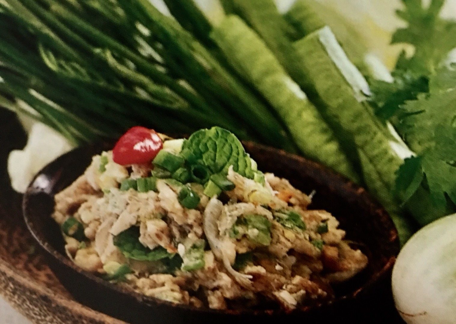 ใส่น้ำปลาร้าที่กรองในหม้ออีกใบ ยกขึ้นตั้งไฟกลาง ใส่หอมแดงเผา กระเทียมเผา พริกขี้หนูเผา พอน้ำเดือดใส่ปลาช่อนลงต้มจนสุก ปิดไฟ ตักขึ้น แกะเอาแต่เนื้อปลาใส่ถ้วย ตักน้ำต้มปลาไว้ประมาณ 1/4 ถ้วย โขลกพริกขี้หนูเผา หอมแดงเผา กระเทียมเผา เข้าด้วยกันพอหยาบ ใส่เนื้อปลาต้ม เห็ดกระด้างและถั่วฝักยาวที่โขลกไว้แล้ว ใส่งาคั่ว โขลกต่อเบาๆ พอเข้ากัน ปรุงรสด้วยน้ำปลา ซีอิ๊วขาว น้ำต้มปลา ใส่ใบสะระแหน่ ผักชีฝรั่ง ต้นหอม คนให้เข้ากัน ตักใส่ถ้วย ตกแต่งด้วยพริกขี้หนูสีแดง เสิร์ฟกับผักสด