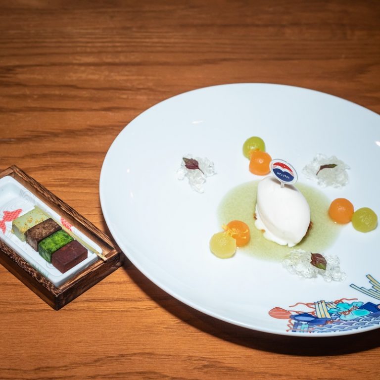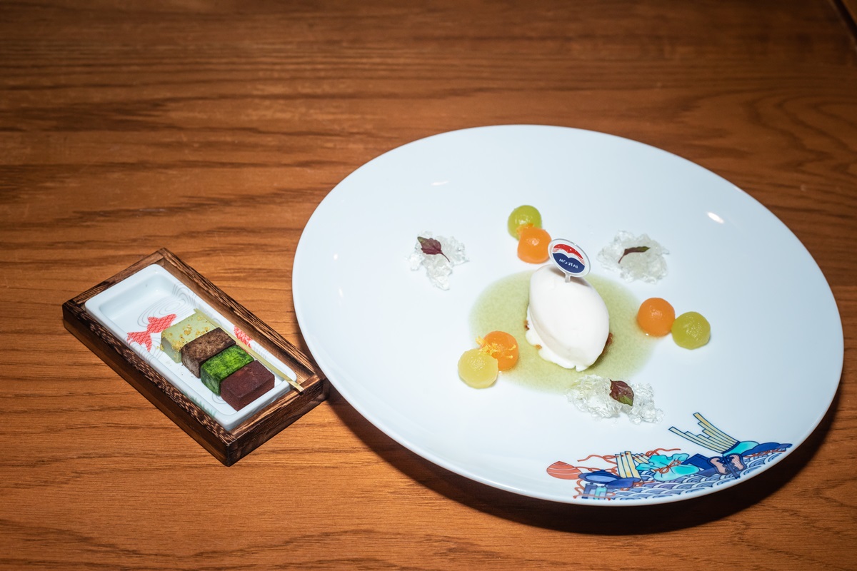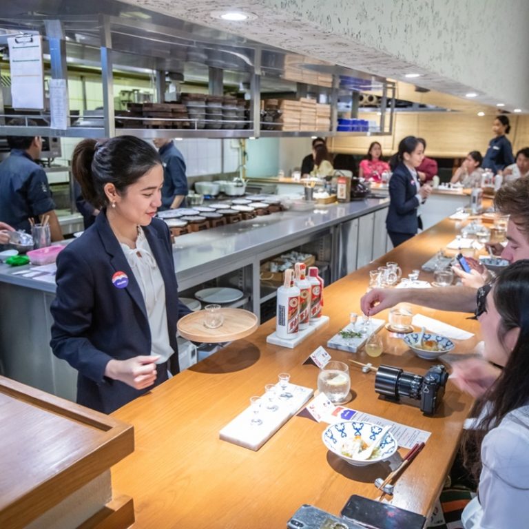 หัวหน้าเชฟ มร. ยูชิ ทาเคยามา ได้ใช้เหมาไถมาเป็นส่วนประกอบในการรังสรรค์เมนูพิเศษ ได้แก่ เทมปุระปูซูไวโยบะโรล โดยรับประทานกับมาโยรสเผ็ดร้อนที่มีเหมาไถเป็นส่วนผสม และเมนูเนื้อแกะย่างที่เสิร์ฟด้วยซอสมิโซะที่มีส่วนผสมของเหมาไถ ตบท้ายด้วยไอศครีมเจลาโต้เหมาไถนมถั่วเหลืองกับเมล่อนที่ตุ๋นในเหมาไถ มร. ยูชิ ทาเคยามา กล่าวว่า “ผมได้นำเอากลิ่นหอมของเหมาไถกับ มิโซะ น้ำมัน และนมถั่วเหลืองมาจับคู่กัน ซึ่งทำให้เกิดรสชาติที่เข้มข้นไปอีกระดับ ทั้งจากกลิ่นสมุนไพรที่เผ็ดร้อน และกลิ่นดอกไม้ที่หอมอบอวล ซึ่งผมรู้สึกเป็นเกียรติอย่างยิ่งที่ได้ร่วมงานกับเหมาไถในครั้งนี้”
