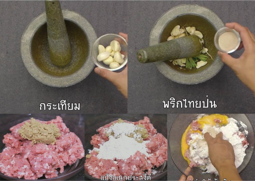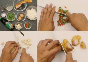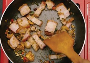– นำกระเทียม, พริกขี้หนู, หมูกรอบ นำมาหั่น
