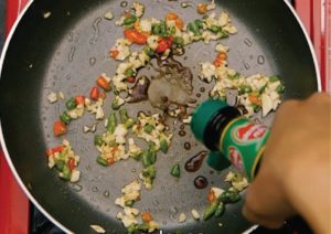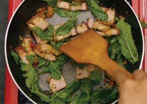 – จากนั้นผัดกระเทียม พริกให้สุก ปรุงรสด้วยซอส, น้ำตาลทราย, ซีอิ๊วขาว, หมูกรอบ ตามด้วยใบกะเพรา และข้าวสวยเป็นอันเสร็จพร้อมเสิร์ฟแล้วจ้า