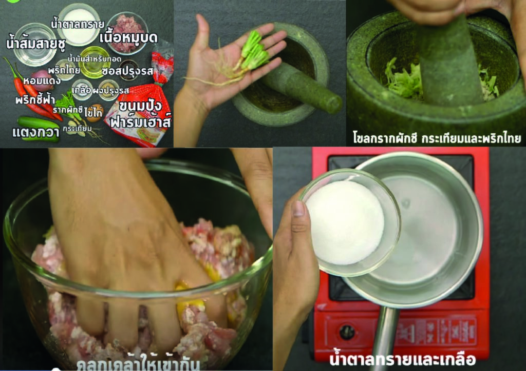 - เสร็จแล้วนำหมูบดมาปรุงรส ใส่เกลือ พริกไทย ซอส ไข่ไก่ และรากผักชีที่เราโขลกไว้ นำมาคลุกเคล้าให้เข้ากัน