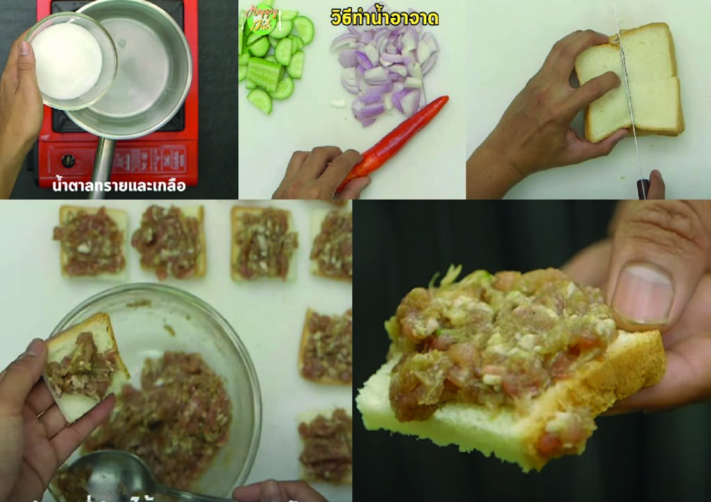 - นำหมูบดที่หมักไว้มาทาบนหน้าขนมปัง