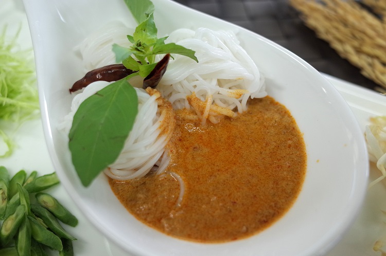 จานแรก “ขนมจีนน้ำยาเป็ด” ไอเดียนี้มาจากตัวเชฟเองเคยได้ลิ้มลอง น้ำยาหมูที่จังหวัดชัยภูมิ จึงมาคิดว่าในเมื่อน้ำยาหมูยังทำได้ น้ำยาเป็ดก็ต้องทำได้เช่นกัน เมื่อทำเสร็จปรากฏว่าผลตอบรับดีเกินคาด รสชาติจัดจ้านเหลือใจ น้ำยากะทิเข้มข้นเช่นเดียวกับน้ำยาอื่นๆ ต่างกันที่น้ำยาเป็ดมีเนื้อเป็ดชิ้นเล็กๆ ที่สับละเอียด หลงเหลือให้เราได้เคี้ยวพอหนึบเล็กๆ เป็นสัมผัสแปลกใหม่ที่น่าประทับใจ