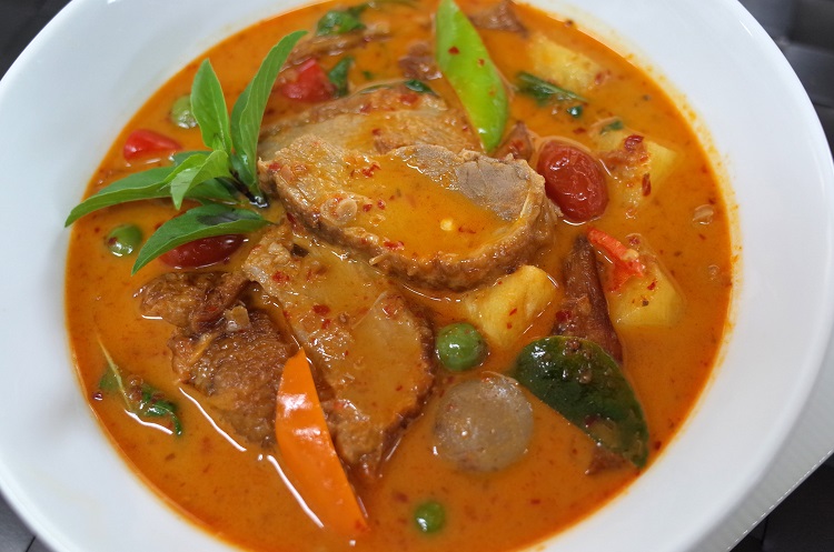 ต่อมา “แกงเผ็ดเป็ดย่าง” เมนูนี้เป็นอาหารไทยโบราณ ที่มีวิธีการทำสุดซับซ้อน ส่วนประกอบเป็นสิบๆ อย่าง แต่รสชาติที่ได้ก็อร่อยล้ำสาสมกับความยากในการทำจริงๆ