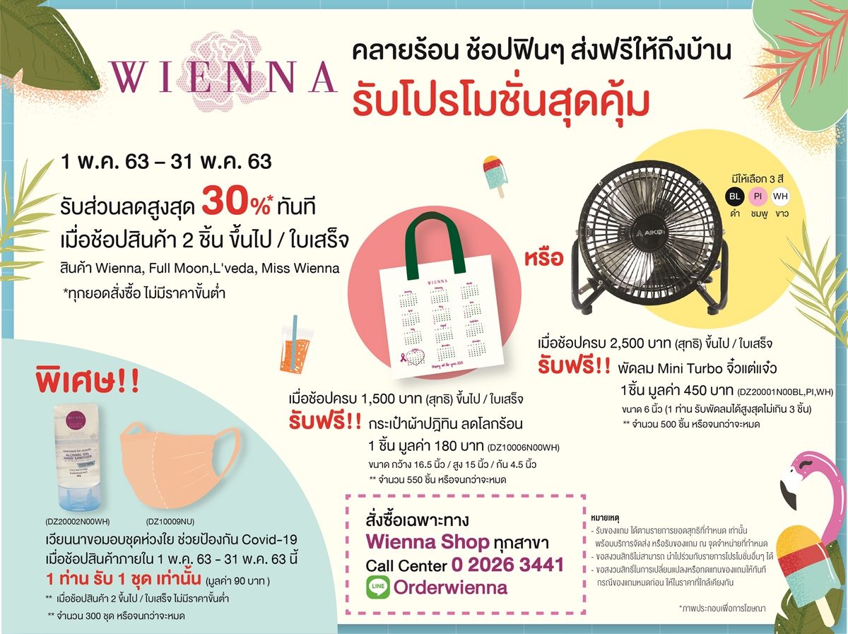 สถานการณ์ไวรัสโควิด-19 เริ่มคลี่คลาย และปลดล๊อกได้หลายภาคส่วน กลุ่มห้างสรรพสินค้าก็กลับมาดำเนินการเปิดได้ตามปกติ โดยทางผลิตภัณฑ์ชุดชั้นในเวียนนา ก็มีความพร้อม ทำความสะอาด ฆ่าเชื้อ และให้บริการแล้วทั้งเวียนนาบราบูติก และเคาน์เตอร์ในห้างสรรพสินค้าทั่วประเทศ ตั้งแต่วันที่ 17 พฤษภาคมที่ผ่านมา โดย ส่งโปรส่วนลดสูงสุด 50 % พร้อมของแถม หวังกระตุ้นผู้บริโภคกลับมาจับจ่ายอีกครั้ง