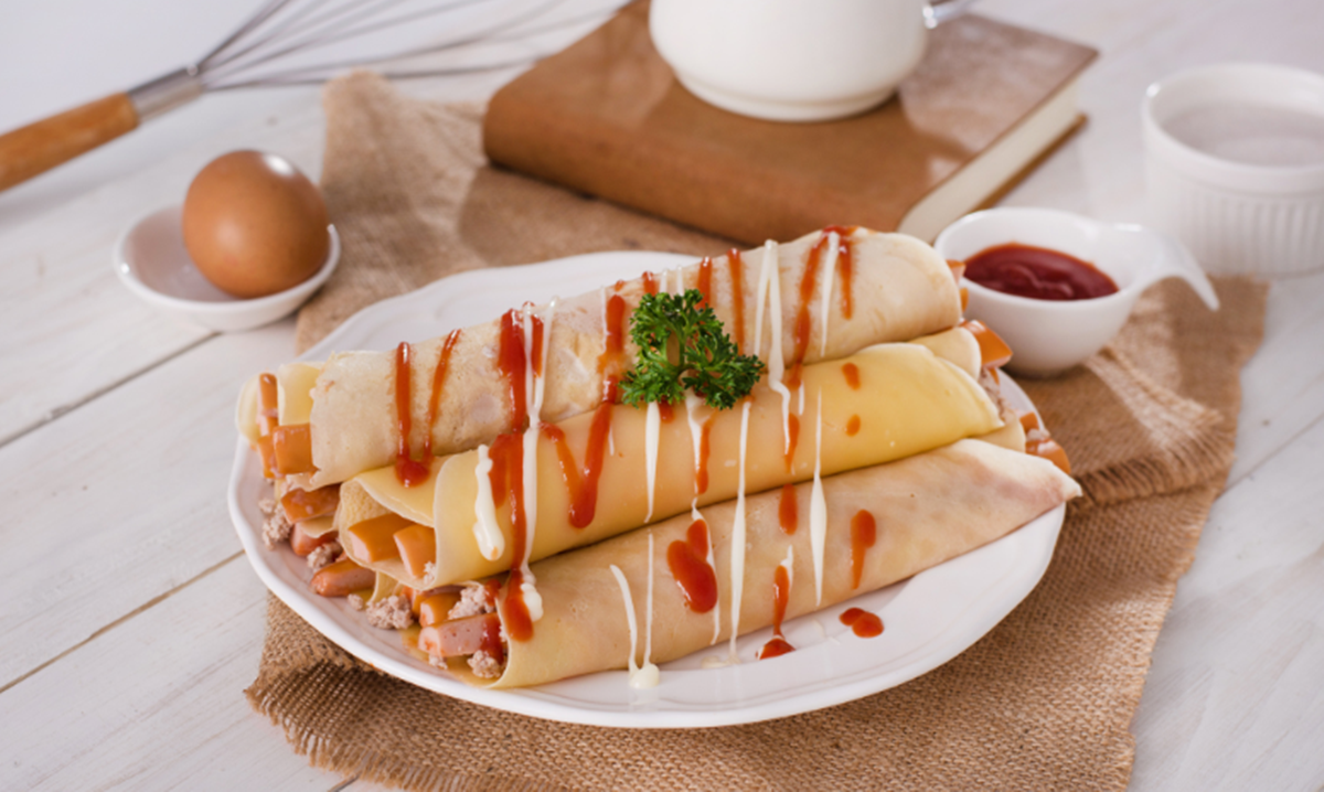 - เมื่อแป้งสุกแล้ว (ใช้เวลาประมาณ 1-2 นาที) นำเอามายองเนสและซอสมะเขือเทศปาดลงบนแผ่นแป้ง แล้วจึงนำไส้กรอก หมูสับมาใส่ตรงกลางไส้ เสร็จแล้วค่อยๆ ม้วนโตเกียวยักษ์บนกระทะให้สวยงาม แค่นี้ก็พร้อมเสิร์ฟความอร่อยชิ้นโตกันได้แล้ว