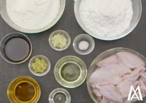 5. เตรียมไก่ เตรียมแป้งที่ผสมแล้ว นำไก่จุ่มลงในแป้ง (แค่พอเคลือบ) สลัดแป้งส่วนเกินออก