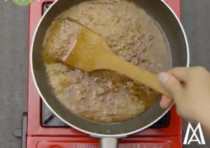 2. จากนั้นใส่ซอสถั่วเหลือง ตามด้วยเหล้ามิริน น้ำผึ้ง เคี่ยวไฟอ่อนๆ (ถ้าไฟแรงเกินจะทำให้ไหม้ง่ายไม่หอม)