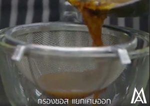 3. เคี่ยวพอเดือดใส่แบะแซ รอเดือดอีกครั้ง ยกลงจากเตา กรองซอสด้วยกระชอน แล้วพักทิ้งไว้