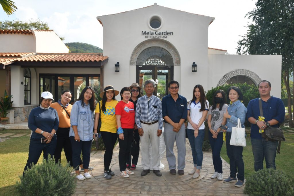 ชื่นชมทุ่งเบญจมาศกันเต็มอิ่ม ก็ได้เวลาอาหารพอดี คณะเราตรงดิ่งไปกินมื้อเที่ยงที่ Mela Garden Retreat Cottage ที่นี่เปิดเป็นที่พักสไตล์รีสอร์ตโอบล้อมด้วยขุนเขา ออกแบบสไตล์อิตาลี โดย Mela เป็นภาษาอิตาลี แปลว่า แอปเปิ้ล รอบๆที่พักเป็นแปลงแอปเปิ้ลขนาดใหญ่กว่า 300 ต้น พร้อมด้วยแปลงกุหลาบและแปลงสมุนไพรที่ออกแบบเป็นตารางสี่เหลี่ยมเหมือนแปลงต้นไม้ตามสวนในต่างประเทศ