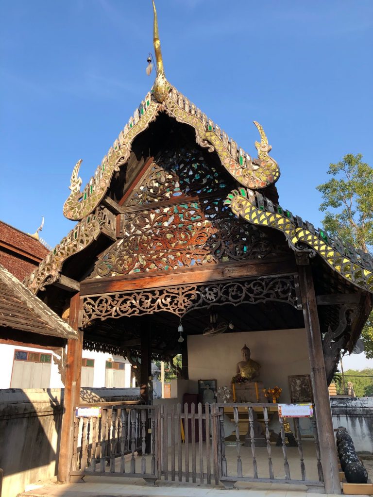 11.ศาลาโถงเป็นไม้ฉลุประดับกระจกอยู่ด้านข้างวิหาร