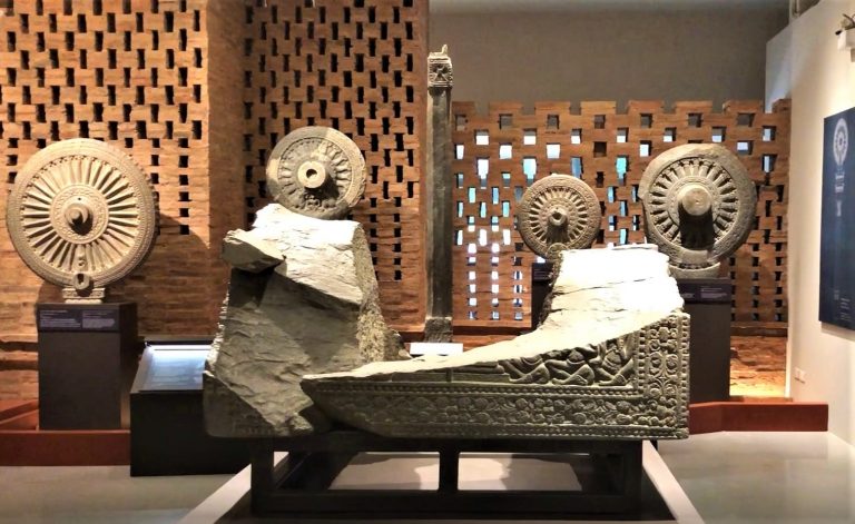 ชิ้นส่วนของแท่นบัลลังก์และธรรมจักร ซึ่งจัดแสดงในพิพิธภัณฑสถานแห่งชาติ พระปฐมเจดีย์