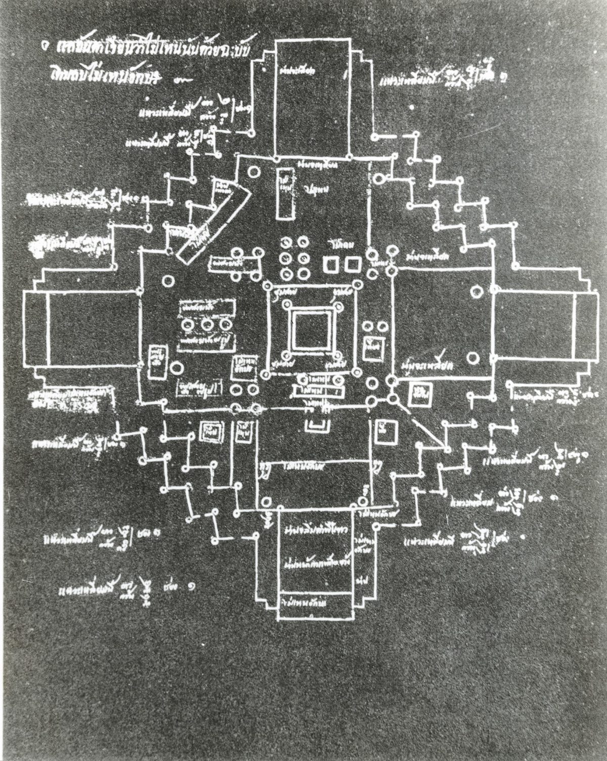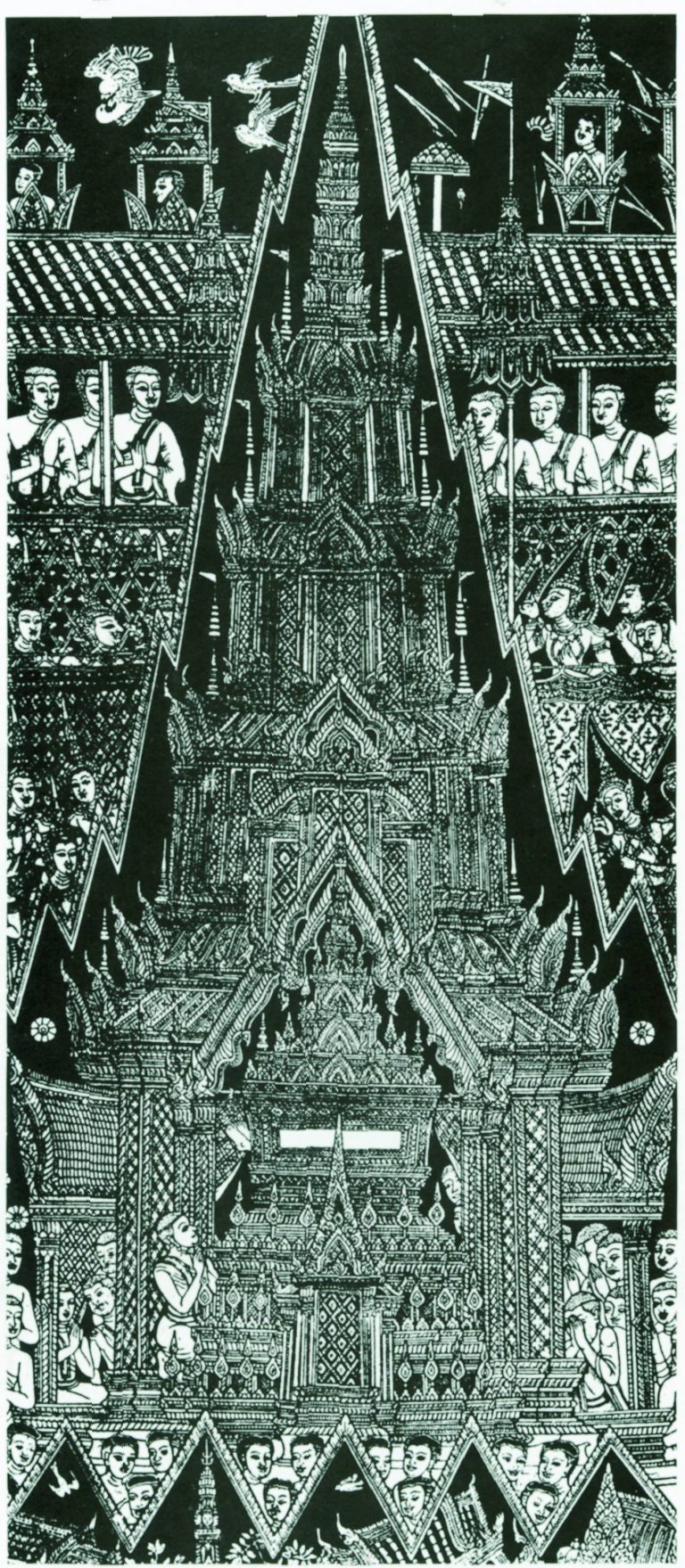 “พระเมรุเอกเสายาว 20 วา ขื่อยาว 7 วา ทรงตั้งแต่ฐานบัตถึงยอดตรี 40 วา มียอดปรางค์ใหญ่ 1 ฐานปรางค์มีชั้นแว่นฟ้ารับสองชั้น ถัดชั้นแว่นฟ้าลงมามีรูปพรหมพักตรประดับยอดฐาน ถัดมามีรูปเทพนมรอบ ถัดลงมามีรูปอสุรแบกถานบัดรอบถานตามช่องซุ้มคฤหกุฎาคารน้อยๆ นั้นมีรูปเทพสถิตยประจำอยู่ทุกช่อง และมุขคฤหกุฎาคารใหญ่ เปนหน้ามุขซ้อน 2 ชั้นทั้ง 4 มุขๆนั้นมียอดปรางค์ย่อมๆ ตั้งอยู่บนหลังคามุขทั้ง 4 ทิศซึ่งเรียกว่าเมรุซีก นั้นที่ระหว่างมุขใหญ่ในร่วมมณฑปที่ย่อเก็จนั้นมียอดปรางค์ย่อมๆตั้งอยู่ตามระหว่างมุขนั้นทั้ง 4 ทิศที่เรียกว่าเมรุแซก แล้วมีหลังคาใหญ่ซ้อนสองชั้นรองหลังคามุขเมรซีกนั้นๆ เปนมุขยาวออกมาทั้ง 4 ทิศ ที่อกไก่บนหลังคามุขยาวทั้ง 4 ทิศมียอดบราลีตั้งเปนระยะห่างกันศอกหนึ่งเปนแถวไปทั่วทุกมุข ใต้หน้าบรรณนั้นเปนซุ้มคูหา ตามอกไก่และเชิงกลอนมีครีบสิงห์ครีบครุฑทับหลังคาทั้งสิ้น ตามเชิงกลอนน้ำตกมีพวงมะโหดโคมเพ็ชรห้อยตามมุขใหญ่เล็กและมณฑปมีช่อฟ้าใบระกาหางหงส์นาคสดุ้งพร้อมสารพางค์ ที่ฝาเมรุมีช่องบัญชรทุกห้อง หลังบัญชรมีซุ้มเปนยอดมณฑปนพศูล หว่างบัญชรมีเสาย่อเก็จประกอบนอกฝา ต้นเสามีกาบพรหมศร กลางเสามีตาบประจำยามรัด ปลายเสา เปนกาบกลีบบัวทรงเครื่อง บนปลายเสามีทวยนาครับเชิงกลอนยอดปรางค์และหลังคาหน้ามุขช่อฟ้าใบระกาบราลีฝาหน้าบัญชรจรนำลำยอง ล้วนแต่หุ้มดีบุกทองน้ำตะโกทั้งสิ้น”