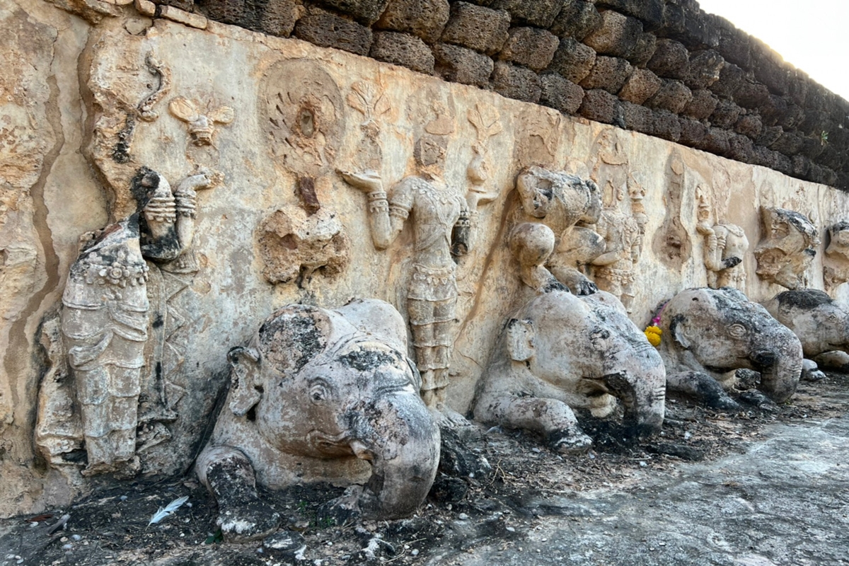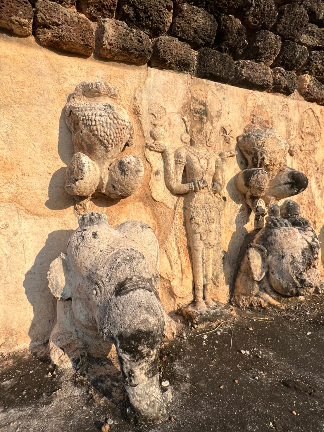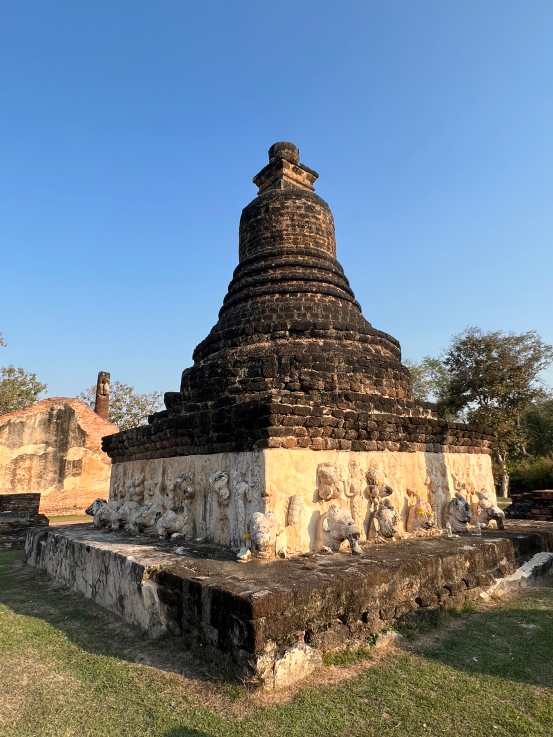 สำหรับประติมากรรมรูปช้างที่ประดับอยู่ที่ฐานของเจดีย์องค์นี้ มีลักษณะพิเศษต่างไปจากที่อื่น นั่นคือมีสิงห์ประดับอยู่บนหลังช้างด้วย ซึ่งไม่เคยพบมาก่อนในเจดีย์องค์อื่นๆ ในศิลปะสุโขทัย