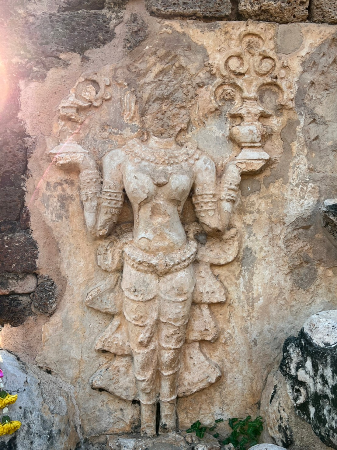 ไฮไลต์ของที่นี่คือ ที่บริเวณฐานเจดีย์ประธานมีภาพปูนปั้นประดับอยู่โดยรอบ โดยปั้นเป็นรูปบุคคลทั้งบุรุษและสตรี สวมอาภรณ์และเครื่องประดับต่างๆ ในมือถือภาชนะมีพันธุ์พฤกษางอกออกมา ซึ่งแสดงถึงความเจริญงอกงามและความอุดมสมบูรณ์ ทั้งยังมีปูนปั้นรูปช้างและสิงห์ประดับอยู่ด้วย