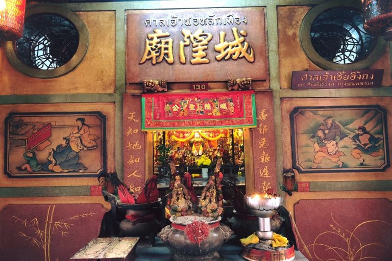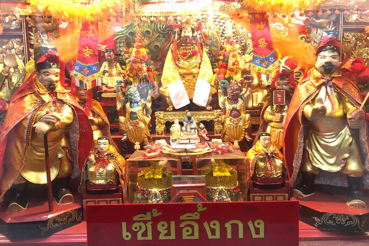สำหรับเทพเจ้าเซี้ยอึ้งกง ซึ่งเป็นประธานของศาลเจ้าแห่งนี้ เทพดังกล่าวคือเทพหลักเมืองตามความเชื่อของคนจีน ในเมืองจีนจะมีการตั้งศาลเจ้าหลักเมืองขึ้นบริเวณข้างกำแพงเมืองหรือคูเมืองบริเวณที่เป็นทางเข้าออกเมือง ทุกคนจะต้องผ่านศาลนี้เพื่อเป็นการขออนุญาต นอกจากนี้ยังมีความเชื่อว่าเทพเจ้าหลักเมืองมีหน้าที่ควบคุมการเข้าออกของดวงวิญญาณ หากมีผู้เสียชีวิตจะต้องมาไหว้เพื่อแจ้งบอกกล่าวองค์เทพหลักเมืองให้ทราบก่อนทุกครั้ง ก่อนที่จะมีการเคลื่อนย้ายนำศพไปฝัง สำหรับที่ศาลเจ้าเซี้ยอึ้งกงแห่งนี้มีคติความเชื่อเช่นเดียวกัน