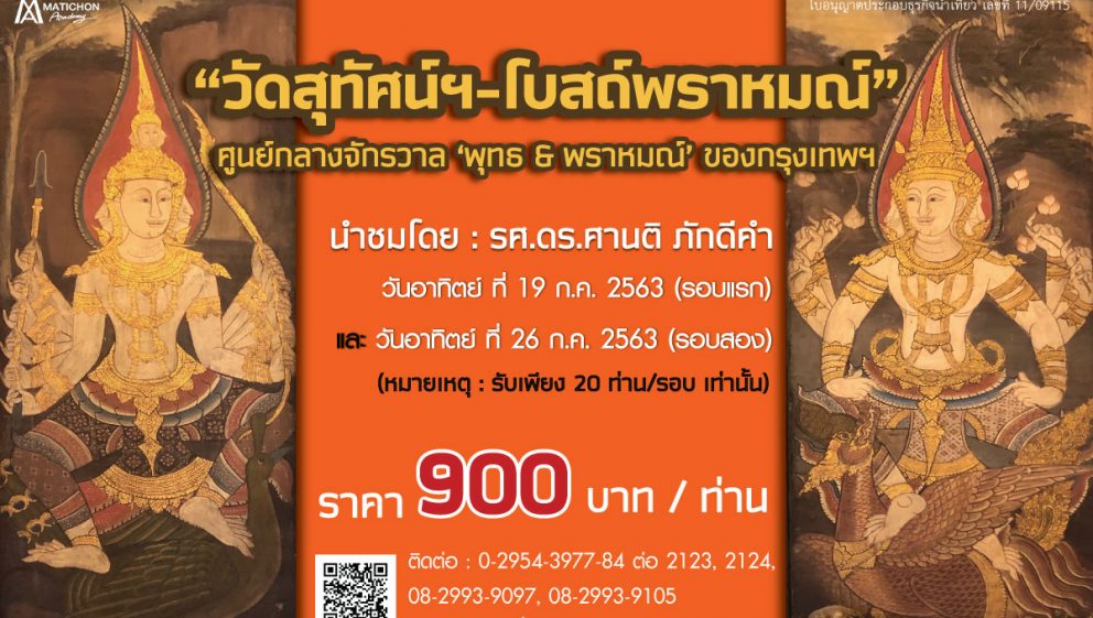 11.30 น. เข้าชม เทวสถานโบสถ์พราหมณ์ หรือที่คนทั่วไปนิยมเรียกกันว่า “โบสถ์พราหมณ์” นับว่าเป็นศาสนสถานของศาสนาพราหมณ์–ฮินดู ที่มีความสำคัญมากที่สุดในประเทศไทย โดยรัชกาลที่ 1 โปรดฯ ให้สร้างขึ้นใจกลางเมืองเพื่อเป็นหลักชัยสำคัญคู่พระนคร ชมเทวรูปองค์สำคัญ เช่น พระอิศวรสำริด ศิลปะสุโขทัย, พระคเณศสำริด ศิลปะอยุธยา, และพระนารายณ์สำริด ศิลปะสุโขทัย เคียงข้างด้วย พระลักษมี (พระศรีเทวี) และพระมเหศวรี (ภูมิเทวี) พร้อมฟังเรื่องราวความสำคัญและบทบาทของพราหมณ์ในราชสำนักของไทย จากนั้นเดินออกมาชมเสาชิงช้า พร้อมฟังเรื่องพิธี “ยัมปวาย–ตรียัมปวาย” แบบละเอียด